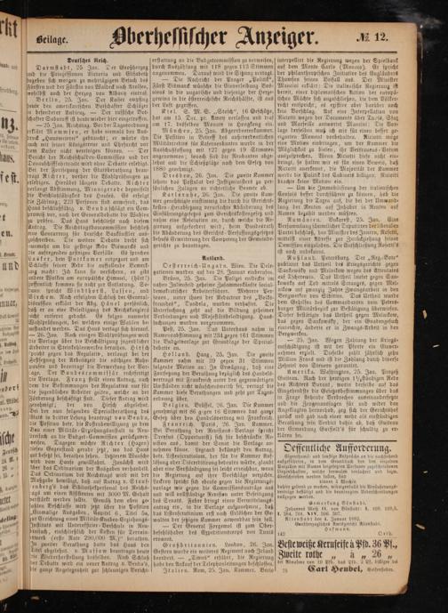 Darmstadt, 25 Jan. Der Großherzog und die Prinzessinnen Victoria und Elisabeth begeben sich morgen zu mehrtägigem Besuch des Fuͤrsten und der Fürstin von Waldeck nach Arolsen, oselbst auch der Herzog von Albany eintraf.