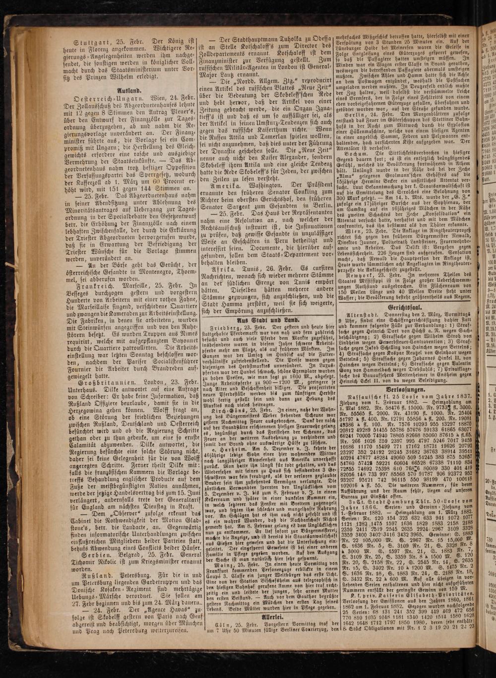 Oesterreich-Ungarn. Wien, 24. Febr. Der Zollausschuß des Abgeorduetenhauses lehnte mit 12 gegen 8 Stimmen den Autrag Plener's, über den Entwurf der Finanzzölle zur Tages— ordnung überzugehen, ab und nahm die Re— gierungsvorlage unverändert an. Der Finanz minister führte aus, die Vorlage sei ein Com⸗ promiß mit Ungarn; die Herstellung des Gleich— gewichts erfordere eine rasche und ausgiebige Vermehrung der Staatseinkünfte.— Das Ab⸗ geordnetenhaus nahm trotz heftiger Opposition der Verfassungspartei das Sperrgesetz, wodurch der Kaffeezoll ab 1. März um 60 Procent er— höht wird, mit 151 gegen 144 Stimmen an.