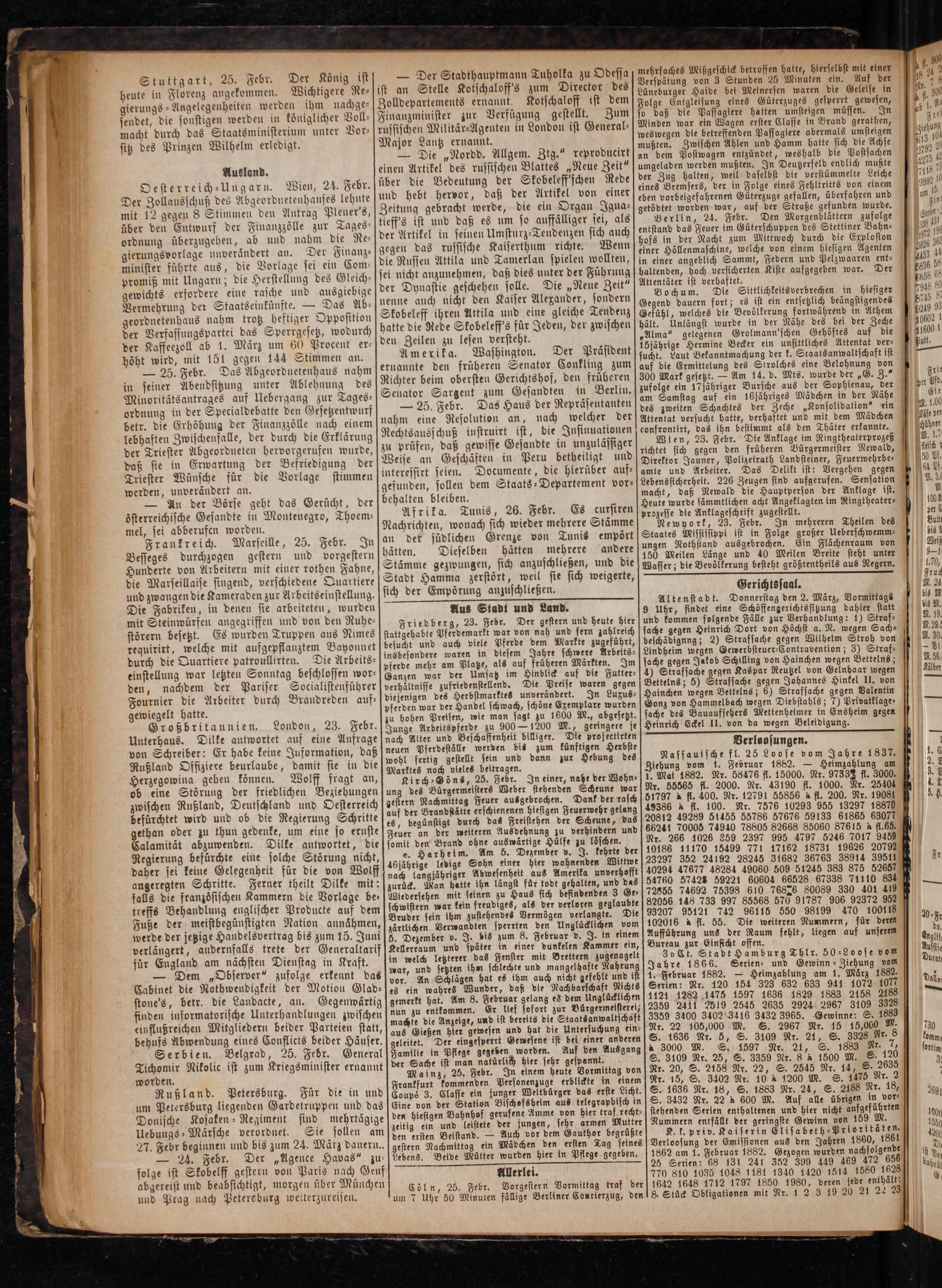 1. Mai 1882. Nr. 58476 fl. 15000. Nr. 97333 fl. 3000. Nr. 55565 fl. 2000. Nr. 43190 fl. 1000. Nr. 25404 51797 à fl. 400. Nr. 12791 55856 à fl. 200. Nr. 19081 49386 à fl. 100. Nr. 7576 10293 955 13297 18870 20812 49289 51455 55786 57676 59133 61865 63077 66241 70005 74940 78805 82668 85060 87615 à fl. 65. Nr. 266 1026 359 2397 995 4797 5246 7017 9459 10186 11170 15499 771 17162 18731 19626 20792 23297 352 24192 28245 31682 36763 38914 3951“ 40294 47677 48284 49060 509 51245 383 875 52657 54760 57423 59221 60604 66528 67338 71110 834 72855 74692 75398 610 76876 80089 330 401 419 82056 148 733 997 85568 570 91787 906 92372 952 93207 95121 742 96115 550 98199 470 100118 102016 à fl. 55. Die weiteren Nummern, für deren Aufführung uns der Raum fehlt, liegen auf unserem Bureau zur Einficht offen.