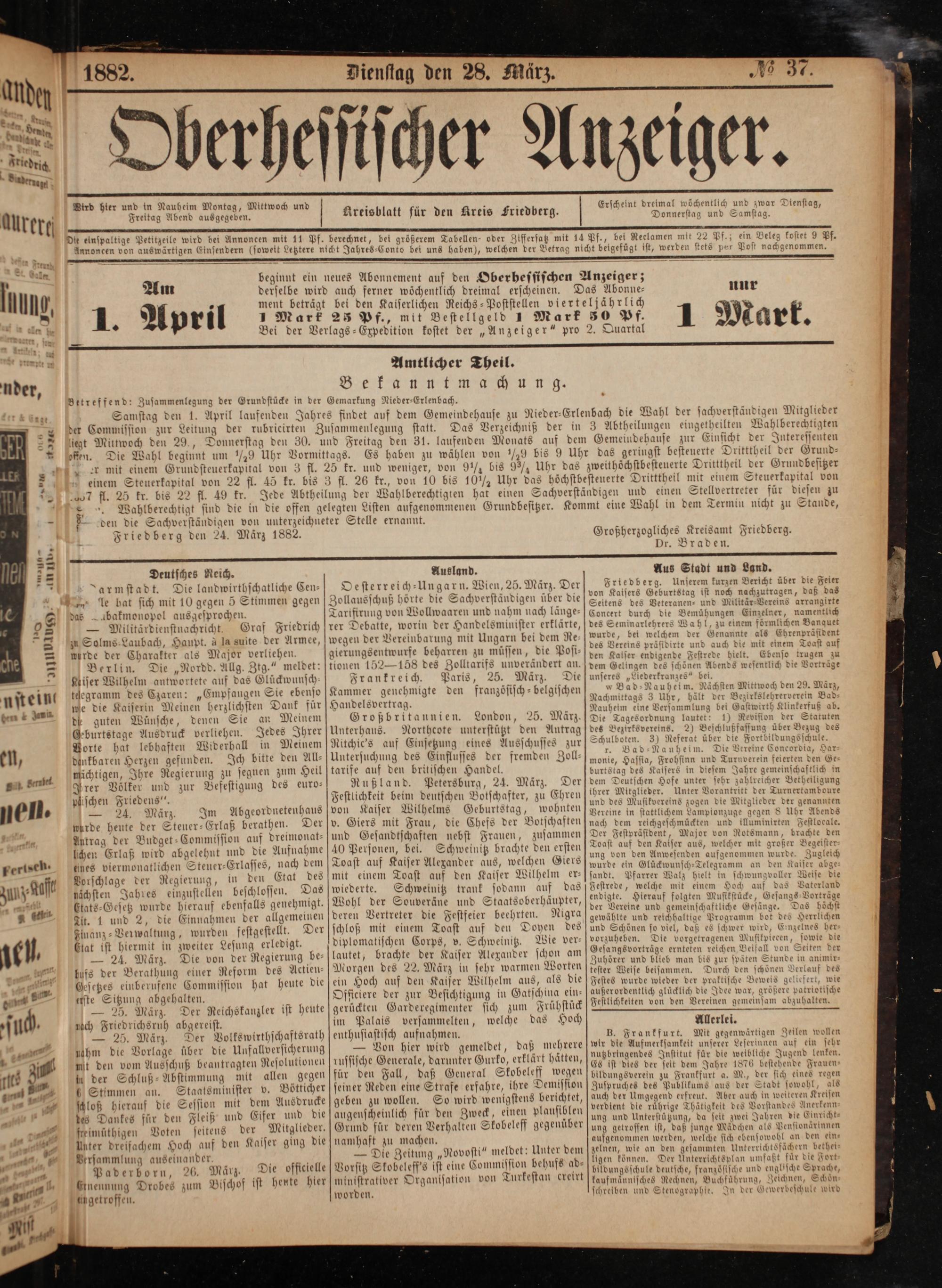 beginnt ein neues Abonnement auf den Oberhessischen Anzeiger; derselbe wird auch ferner wöchentlich dreimal erscheinen. ment beträgt bei den Kaiserlichen Reichs-Poststellen vierteljährlich 1 Marf 28 Pf., mit Bestellgeld 1 Mark 30 Pf. Bei der Verlags-Expedition kostet der„Anzeiger“ pro 2. Quartal