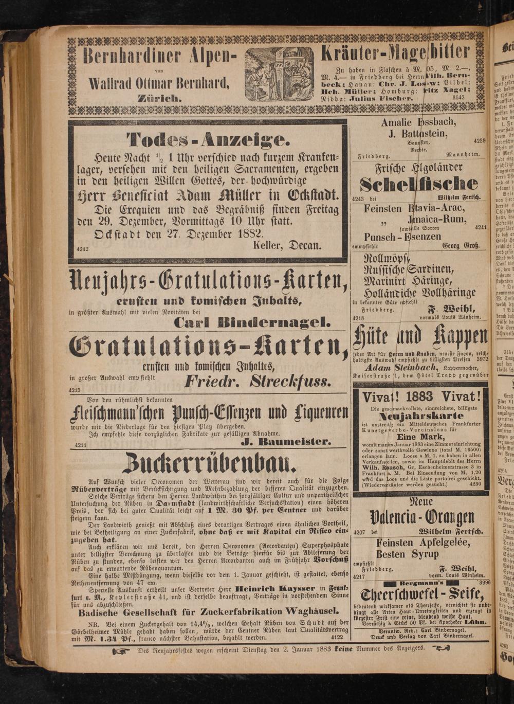 1 Des Nenjahrsfestes wegen erscheint Dienstag den 2. Januar 1883 feine