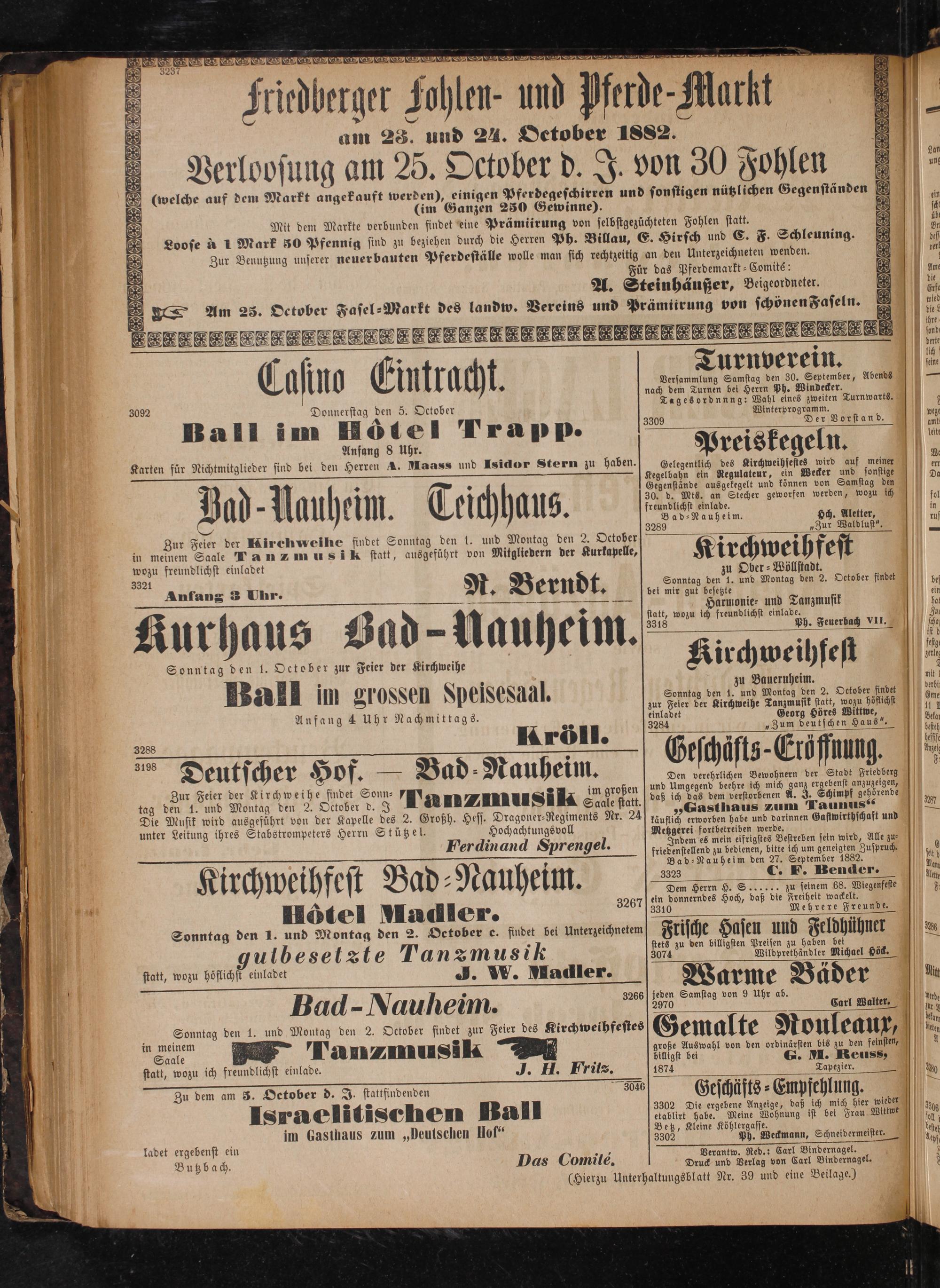 zu Bauernheim. Sonntag den 1. und Montag den 2. October findet zur Feier der Kirchweihe Tanzmusik statt, wozu höflichst einladet Georg Höres Wittwe, 3284„Zum deutschen Haus“.
