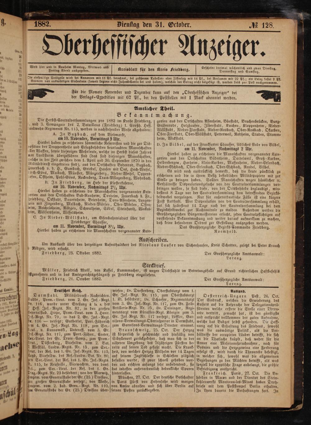 i Rödgen, wird ersucht. Friedberg, 23. Oktober 1882.