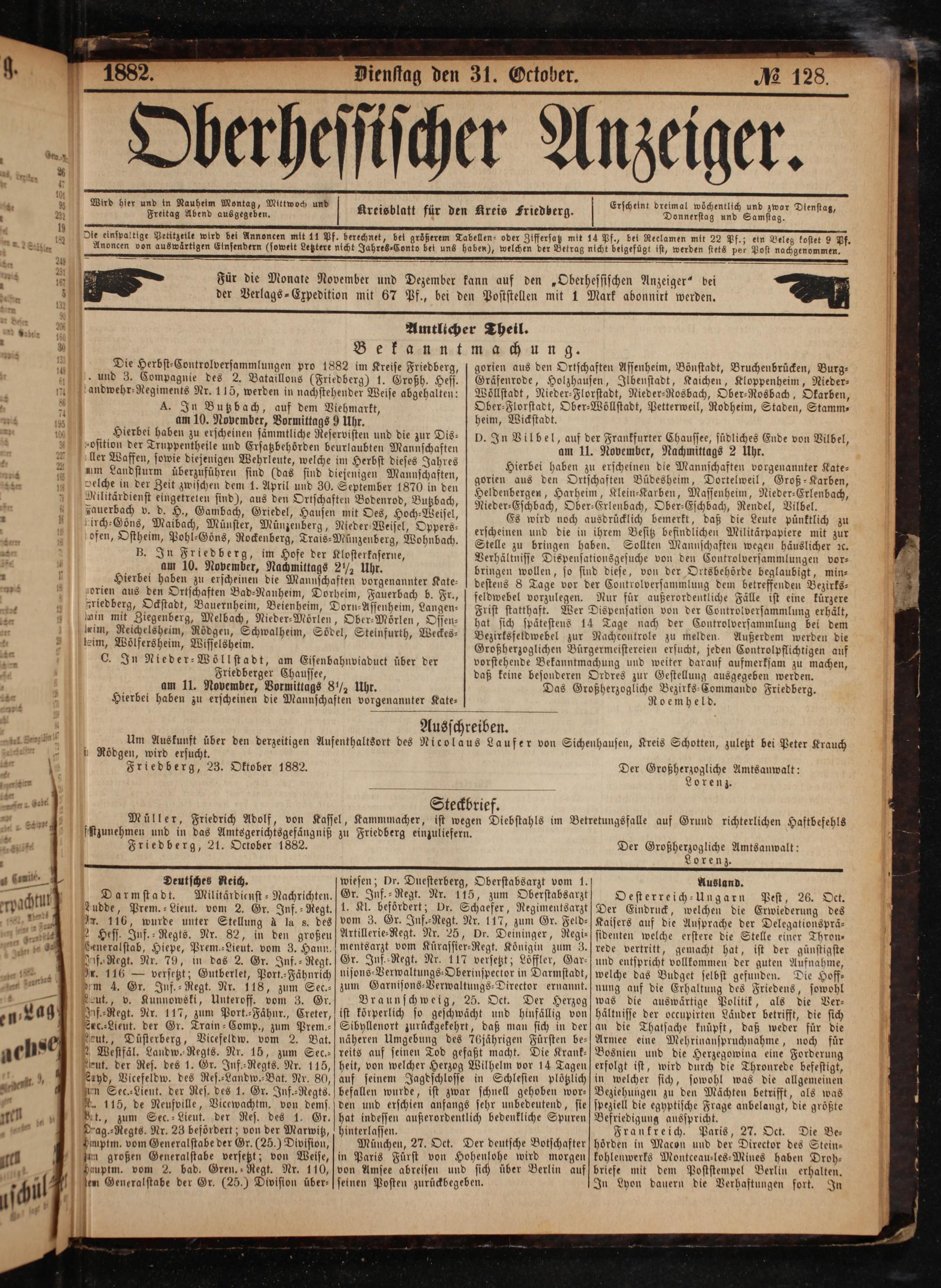 Für die Monate November und Dezember kann auf den„Obethessischen Anzeiger“ bei der Verlags-Expedition mit 67 Pf., bei den Poststellen mit 1 Mark abonnirt werden.