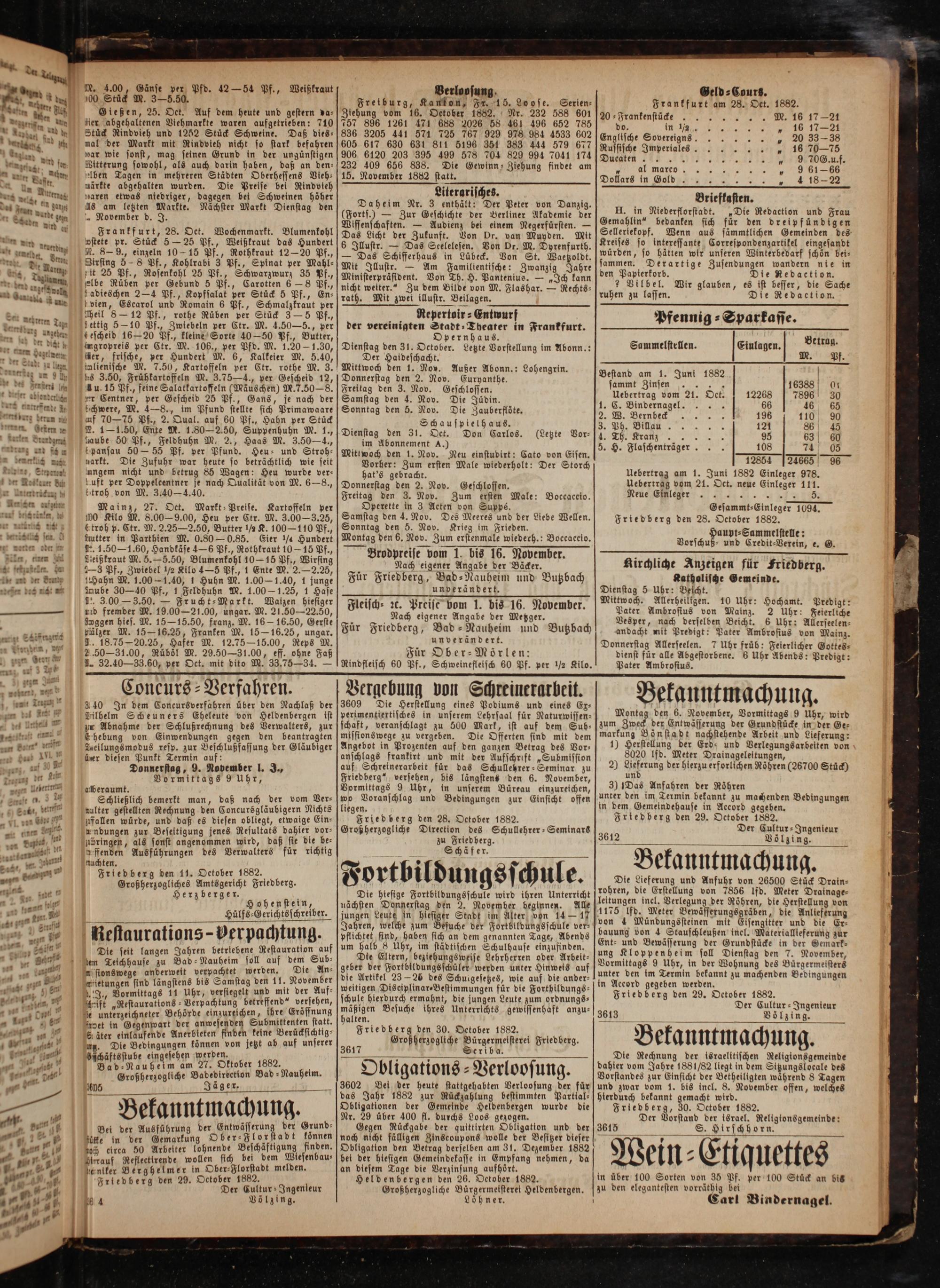 Neue Einleger.. Gesammt⸗Einleger 1094. Friedberg den 28. October 1882.