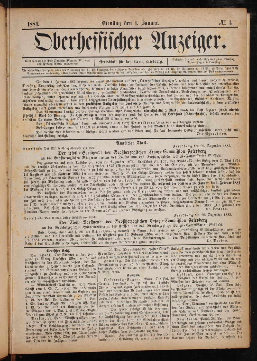 Mit dem 1. Januar 1884 beginnt ein n Dienstag, Donnerstag und Samstag, erscheinen wi