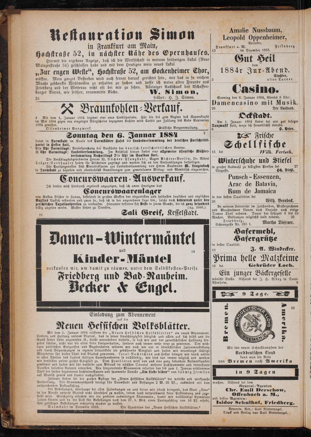 Mit dem 1. Januar 1884 eröffnen die„Neuen Hessischen Volksblätter“ ein neues Abonnement. Tendenz und Haltung unseres Blattes, das in seiner Unabhängigkeit lediglich und allein auf sich selbst und die Gunst seiner Leser angewiesen ist, bleibt unverändert dieselbe, so daß wir uns der zuversichtlichen Hoffnung hin— geben dürfen, nicht nur die alten Leser fortzuerhalten, sondern auch immer mehr neue zu gewinnen. Den wich— tigen politischen Ereignissen und Begebenheiten widmen wir nach wie vor in übersichtlicher Zusammenstellung und durch Besprechungen in eigenen Leitartikeln die gebührende Sorgfalt und haben wir neuerdings tüchtige Mitarbeiter für diesen Theil des Blattes gewonnen. Local-Nachrichten aus Hessen bringen wir durch unsere in allen Theilen des Landes thätigen Correspondenten so vollständig, wie dies nur immer möglich und wenden wir denselben unsere größte Sorgfalt zu. Dem Feuilleton wird von uns eine ganz besondere Aufmerksamkeit gewidmet und haben wir für dasselbe zum Abdruck im nächsten Qnartal mehrere hochspannende und interessante Novellen beliebter Autoren erworben. Neu hinzutretende Abonnenten erhalten den bis zum 1. Januar erschienenen Theil der soeben begonnenen hochinteressanten und spannende Novelle„Um Liebe leiden“ von Ludwig Ziemssen auf Wunsch gratis und franco nachgeliefert.