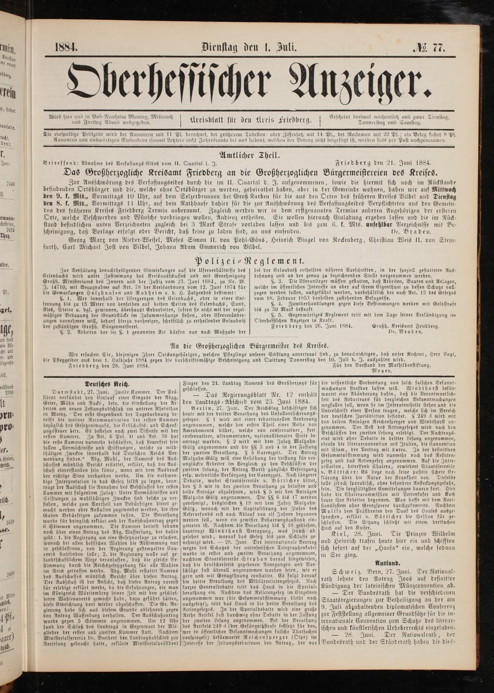 Gegenwärtiges Reglement tritt mit dem Tage seiner Verkündigung im Oberhessischen Anzeiger in Kraft. Friedberg den 26.