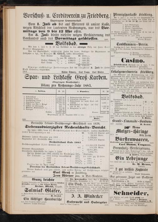 von 8 bis 12 Uhr, wird wiederholt allen Gewerb —— ktreibenden angelegentlichst empfohlen. 1 0 Friedberg den 20. Juni 1884. A. Aetliva. M. Pf. B. Passiv. M. Pf. 2416 Der Vorstand des Lokalgewerbvereins. Volksbad 1. Kassenbestand 2,193 90 1. Außerordentliche Einlagen. 54,733 74 Vo 0 5 2. Darlehen-Conto.. 27,500 65 2. Ordentliche Einlagen„419899 84 Abonnement vom 1. Juli ab: 3. Kaufschilling-Conton. 12,408 63] 3. Reservefonds der vorm. Spar- und Für Familie 8 9 M.— Pf., 4. Hypotheken-Conto 5825 33,889 52 Leihkasse. CC 15200—„ Zellenbäder„„ 5. Cession von Bär& Mengel 59172 4. Reservefonds der Spar- und Leih— 65„ Zellenbäder an Kinder von 10-14 6. Cession auf Güterpacht.. 558— kasse(E. G.) 3 1723665 Jahren. 5 2 7. Mobilien(Kassenschrank ꝛc.) 285 60] 5. Reingewinn in 1883. 467 46, Kinderzellenbäder 155 8. Vorlagen V 109 17—„ Bassin.„„„„ S 77 557 Summa 477,537 19„ Schwimm Unterricht pro Stunde.— 1 5. a 7 Die bis 1. Juli abonnirt gewesenen Leute erhalten Mitgliederzahl am 31. Dezember 1883= 111. 4 1 über noch zu leistenden Betrag an der Kasse Bescheid. Für den Vorstand: 2501 C. Walter Müller, 5— 2490 Direktor.
