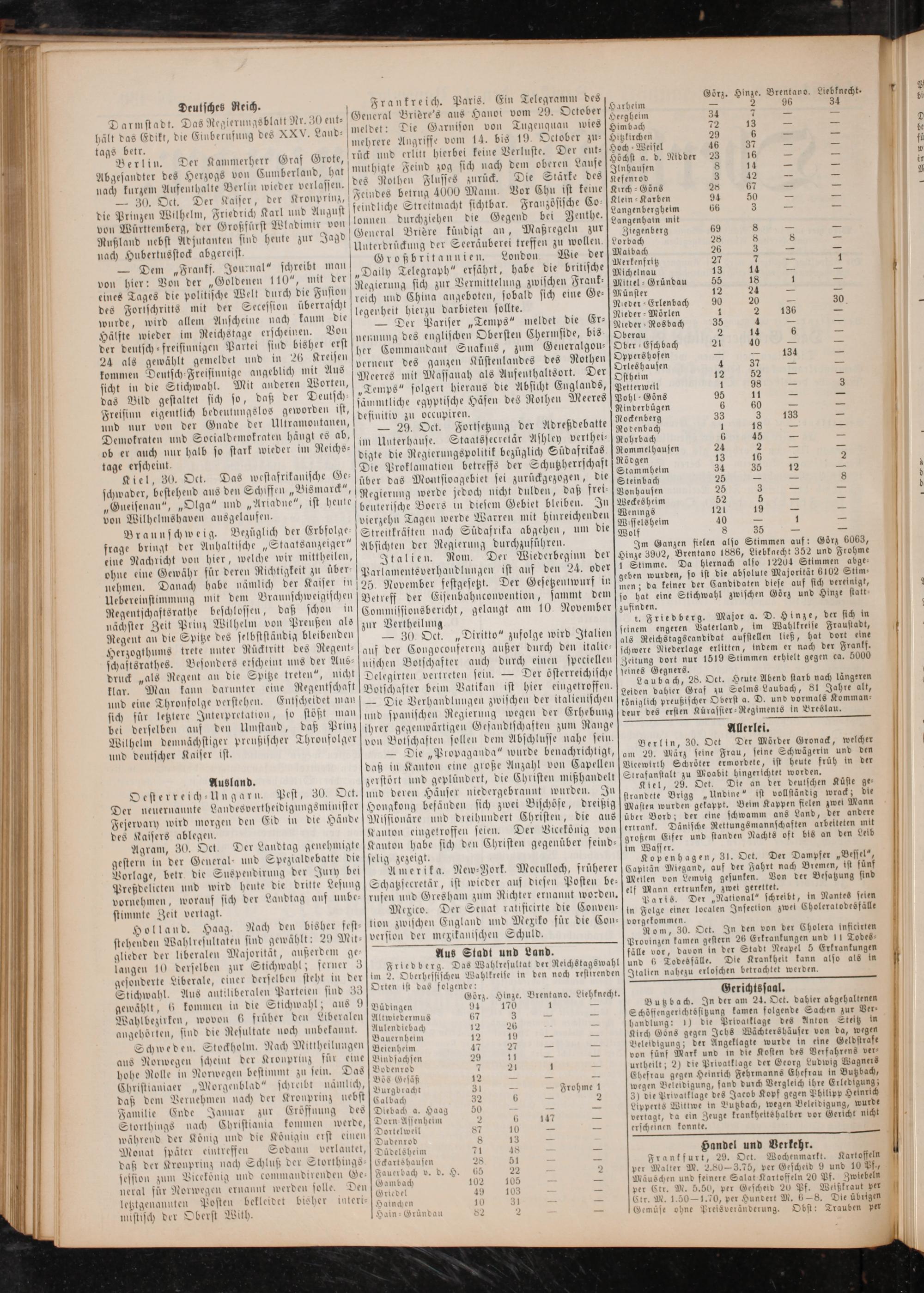 Absichten der Regierung durchzuführen. Italien. Rom. Der Wiederbeginn der Parlamentsverhandlungen ist auf den 24. oder 25. November festgesetzt. Der Gesetzentwurf in Betreff der Eisenbahnconvention, sammt dem Commissionsbericht, gelangt am 10 November zur Vertheilung — 30 Oct.„Diritto“ zufolge wird Italien auf der Congoconferenz außer durch den italie— nischen Botschafter auch durch einen speciellen Delegirten vertreten sein.— Der österreichische Botschafter beim Vatikan ist hier eingetroffen. — Die Verhandlungen zwischen der italienischen und spanischen Regierung wegen der Erhebung ihrer gegenwärtigen Gesandtschaften zum Range von Botschaften sollen dem Abschlusse nahe sein. Die„Propaganda“ wurde benachrichtigt, daß in Kanton eine große Anzahl von Capellen zerstört und geplündert, die Christen mißhandelt und deren Häuser niedergebrannt wurden. In Hongkong befänden sich zwei Bischöfe, dreißig Missionäre und dreihundert Christen, die aus Kanton eingetroffen seien. Der Vicekönig von Kanton habe sich den Christen gegenüber feind— selig zezeigt. Amerika. New-Vork. Moculloch, früherer Schatzsecretär, ist wieder auf diesen Posten be— rufen und Gresham zum Richter ernannt worden. Mexico. Der Senat ratificirte die Conven— tion zwischen England und Mexiko für die Con— version der mezikanischen Schuld. Aus Stadt und Land. s Friedberg. Das Wahlresultat der Reichstagswahl im 2. Oberhessischeu Wahlkreise in den noch restirenden Orten ist das folgende: