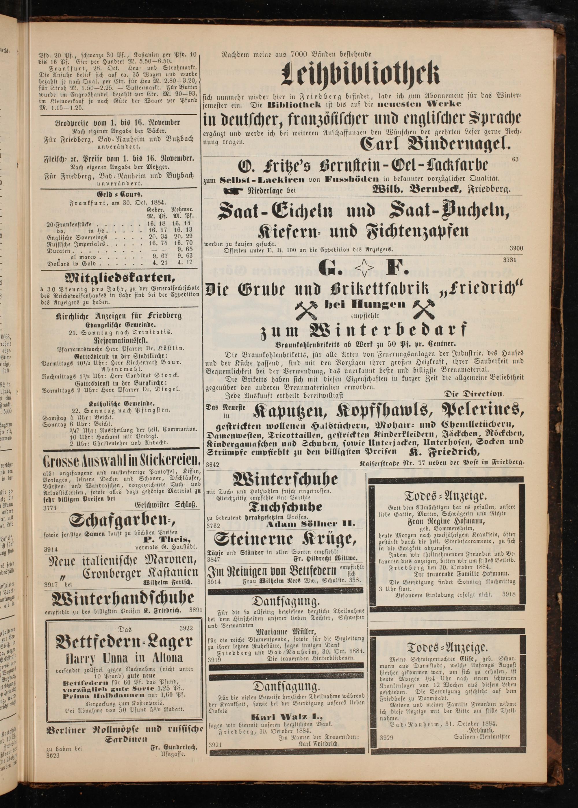3——— 1 3 kannten dies anzeigen, bitten wir um stilles Beileid. 8 f empfie Friedberg den 30. October 1884. Jin Reinigen von Belt edern sich Die trauernde Familie Hofmann.