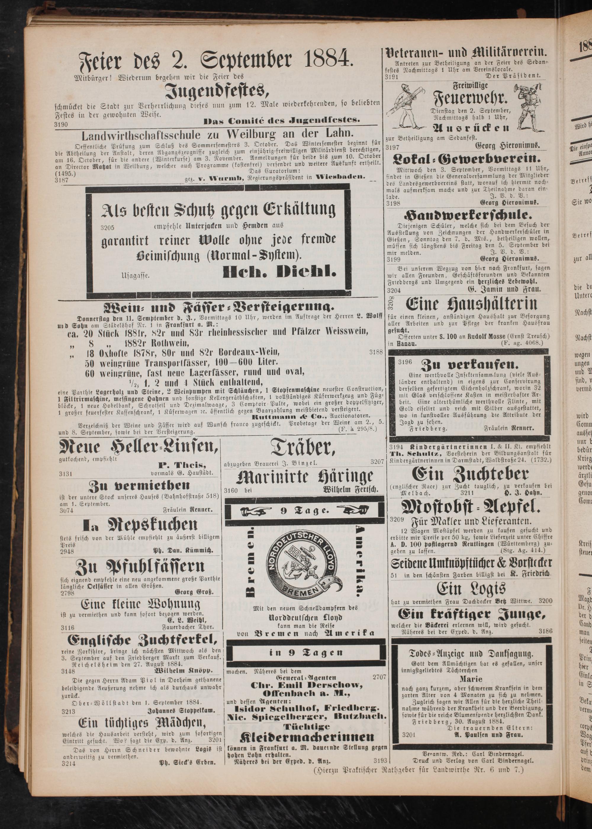 zurück. Offenbach a. M., Ober-Wöllstadt den 1. September 1884. und dessen Agenten: 3213 Johannes Stoppeltam. Isidor Schulhof, Friedberg.