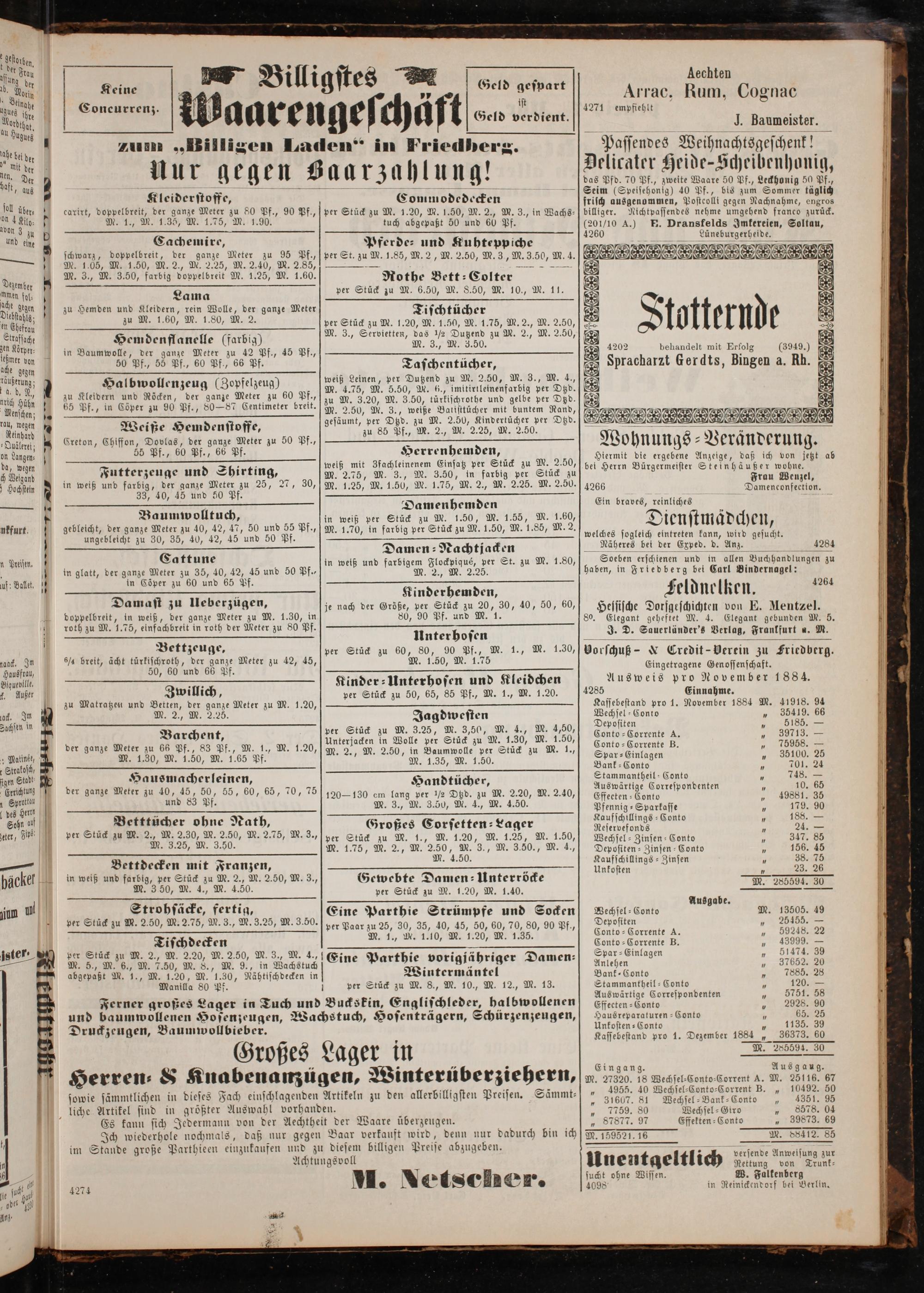 Vorschuß-& Credit- Verein zu Friedberg. Eingetragene Genossenschaft. Ausweis pro November 1884.
