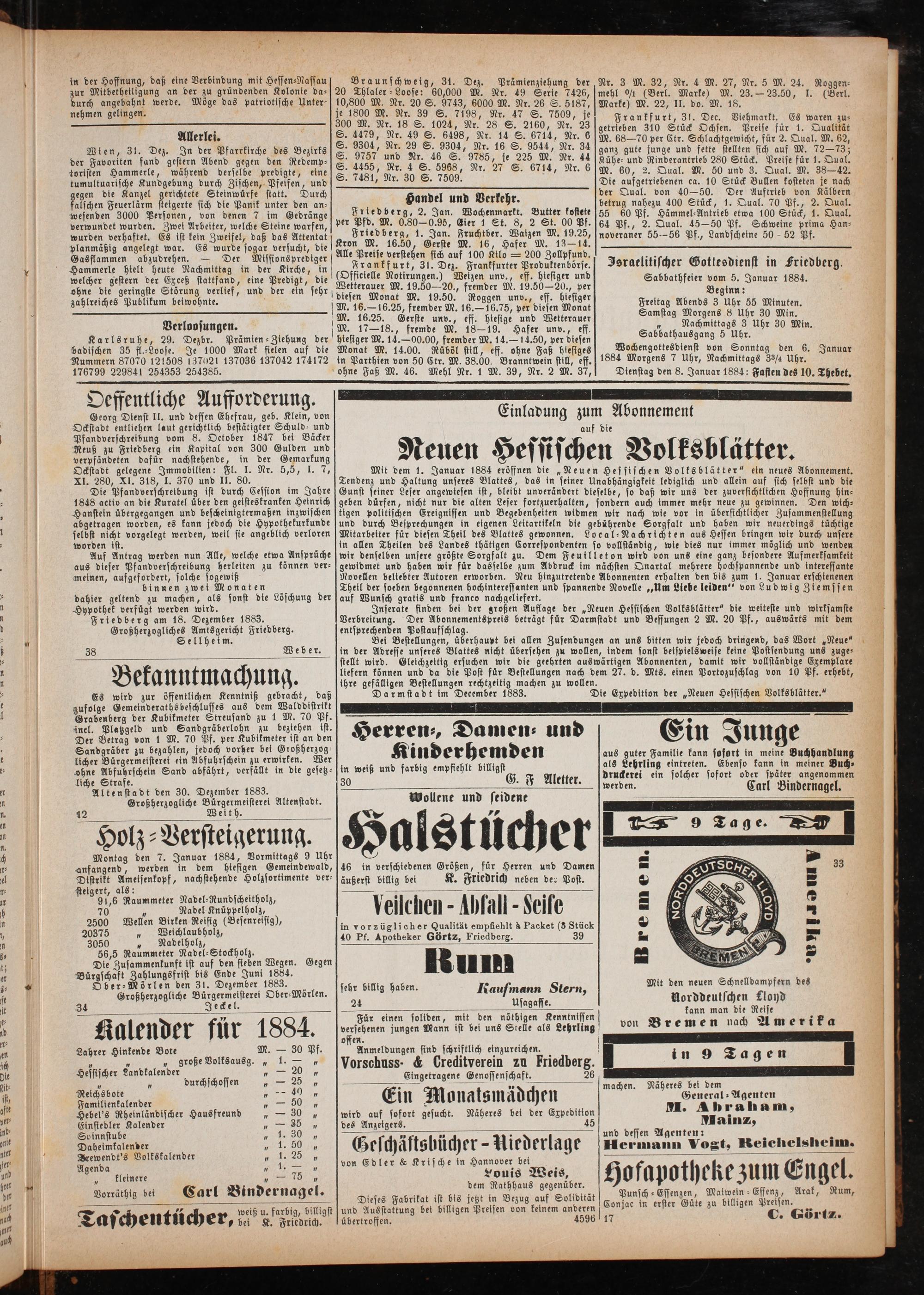 Mit dem 1. Januar 1884 eröffnen die„Neuen Hessischen Volksblätter“ ein neues Abonnement. Tendenz und Haltung unseres Blattes, das in seiner Unabhängigkeit lediglich und allein auf sich selbst und die Gunst seiner Leser angewiesen ist, bleibt unverändert dieselbe, so daß wir uns der zuversichtlichen Hoffnung hin⸗ geben dürfen, nicht nur die alten Leser fortzuerhalten, sondern auch immer mehr neue zu gewinnen. Den wich⸗ tigen politischen Ereignissen und Begebenheiten widmen wir nach wie vor in übersichtlicher Zusammenstellung und durch Besprechungen in eigenen Leitartikeln die gebührende Sorgfalt und haben wir neuerdings tüchtige Mitarbeiter für diesen Theil des Blattes gewonnen. Local-Nachrichten aus Hessen bringen wir durch unsere in allen Theilen des Landes thätigen Correspondenten so vollständig, wie dies nur immer möglich und wenden wir denselben unsere größte Sorgfalt zu. Dem Feuilleton wird von uns eine ganz besondere Aufmerksamkeit gewidmet und haben wir für dasselbe zum Abdruck im nächsten Qnartal mehrere hochspannende und interessante Novellen beliebter Autoren erworben. Neu hinzutretende Abonnenten erhalten den bis zum 1. Januar erschienenen Theil der soeben begonnenen hochinteressanten und spannende Novelle„Um Liebe leiden“ von Ludwig Ziemssen auf Wunsch gratis und franco nachgeliefert.