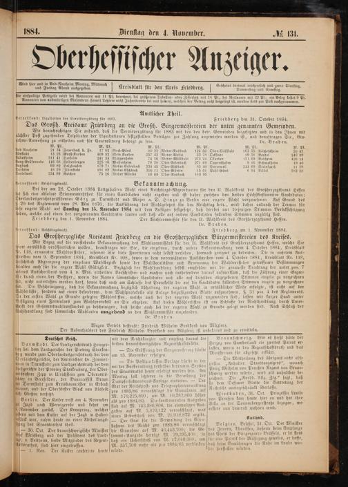 Friedberg den l. November 1884. Der Wahlcommissär für den II. Wahlkreis des Großherzogthums Hessen. Dr. Braden. Jetreffend: Reichstagswahl. Friedberg am 1. November 1884.