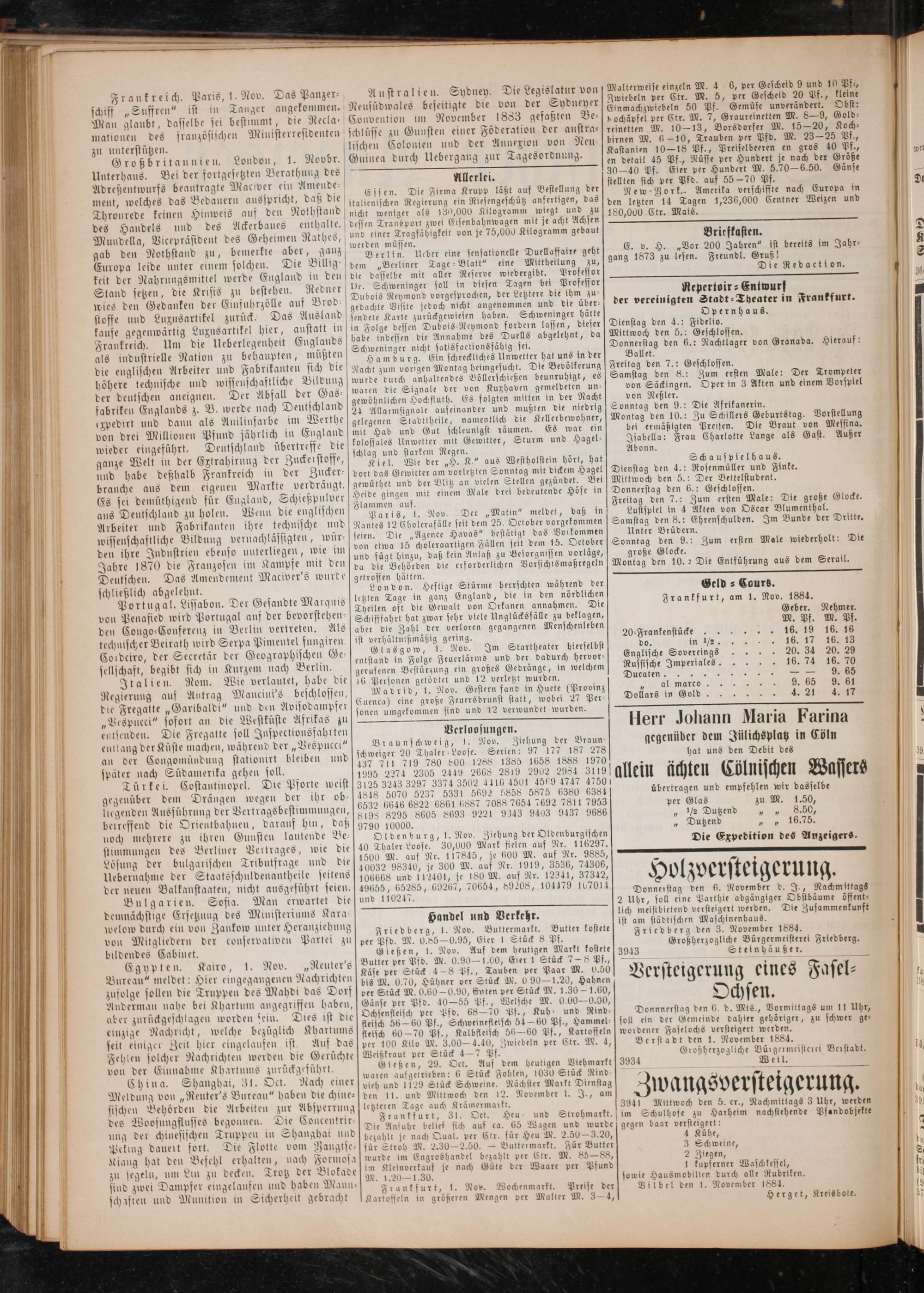 gegen baar versteigert: 4 Kühe, 3 Schweine, 2 Ziegen, 1 kupferner Waschkessel, sowie Hausmoblilien durch alle Rubriken. Vilbel den 1. November 1884.