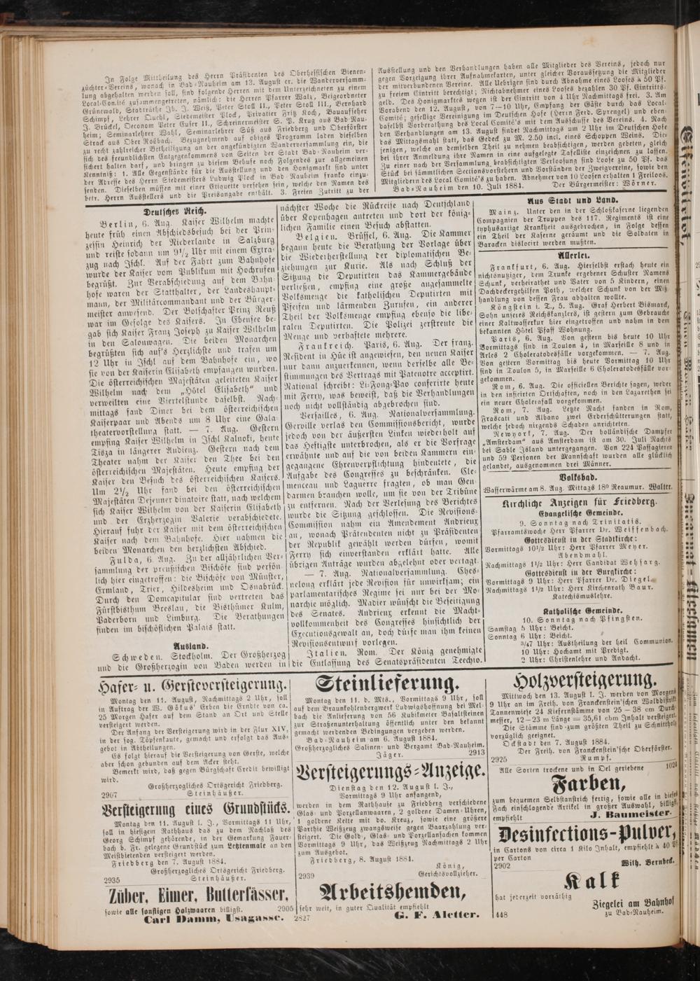 Kirchliche Anzeigen für Friedberg. Evangelische Gemeinde. 9. Sonntag nach Trinktatis. Pfarramtswoche Herr Pfarrer Dr. Weiffenbach. Gottesdienst in der Stadtkirche: Vormittags 10% Uhr: Herr Pfarrer Meyer. Abendmahl. Nachmittags 1½ Uhr: Herr Candidat Wehsarg. Gottesdienst in der Burglirche: Vormittags 9 Uhr: Herr Pfarrer Dr. Diegel⸗ Nachmittags 1½ Uhr: Herr Kirchenrath Baur. Katechtsmuslehre.