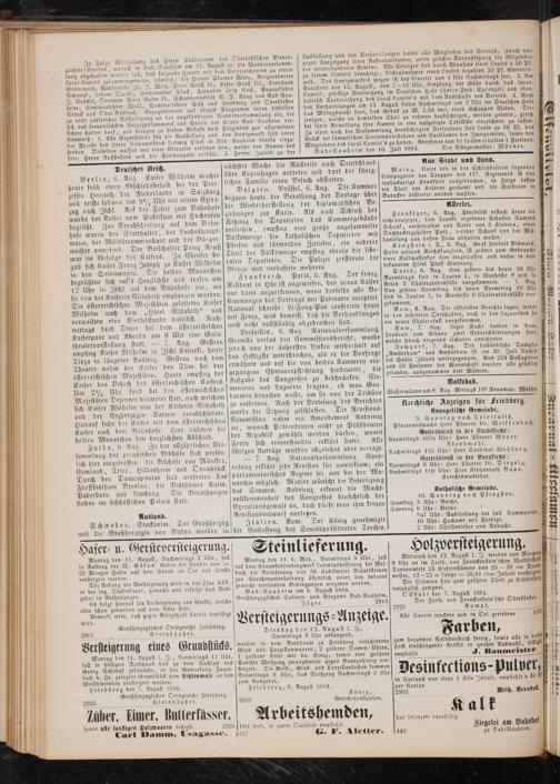 Montag den 11. August, Nachmittags 2 Uhr, soll in Auftrag der W. Gökus' Erben die Erndte von ca. 25 Morgen Hafer auf dem Stand an Ort und Stelle versteigert werden.