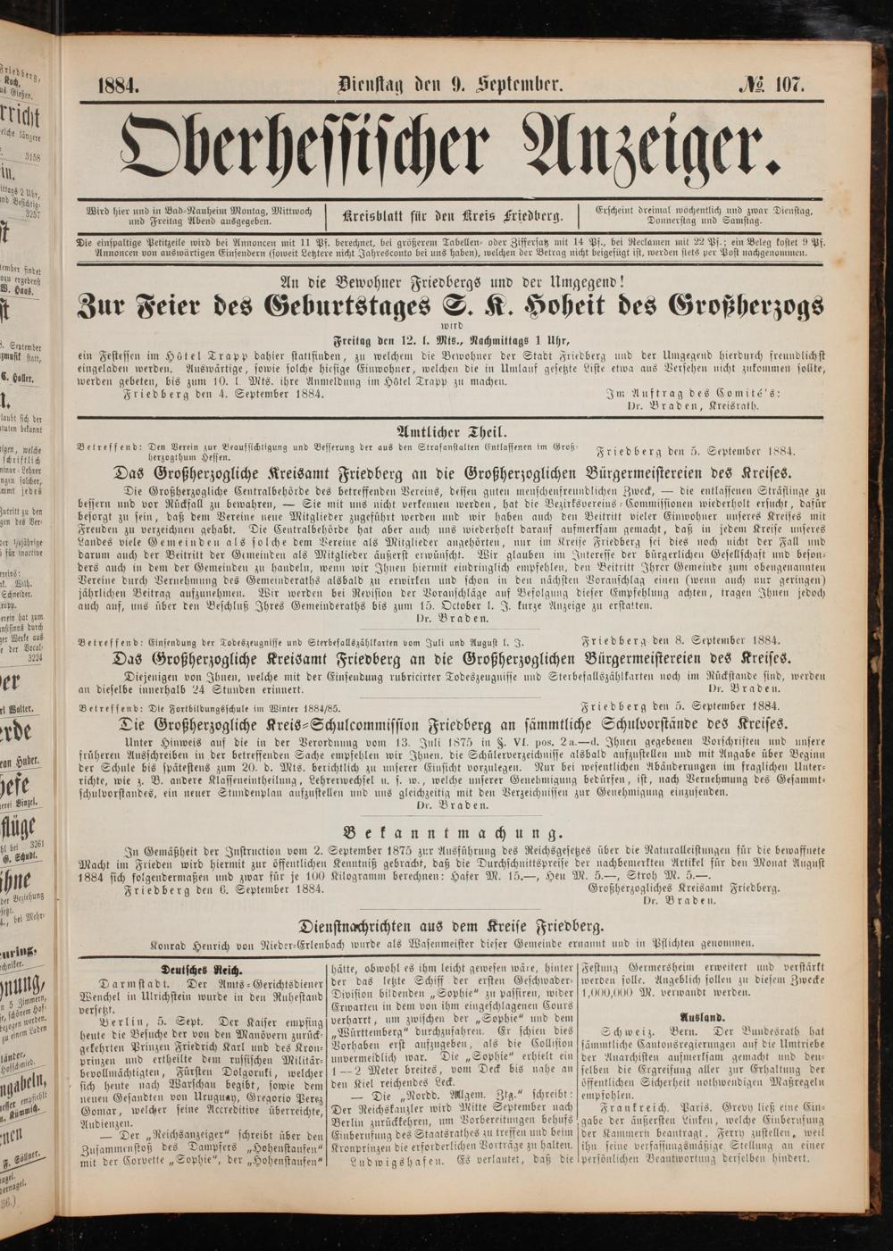 Dr. Braden. Friedberg den 5. September 1884.