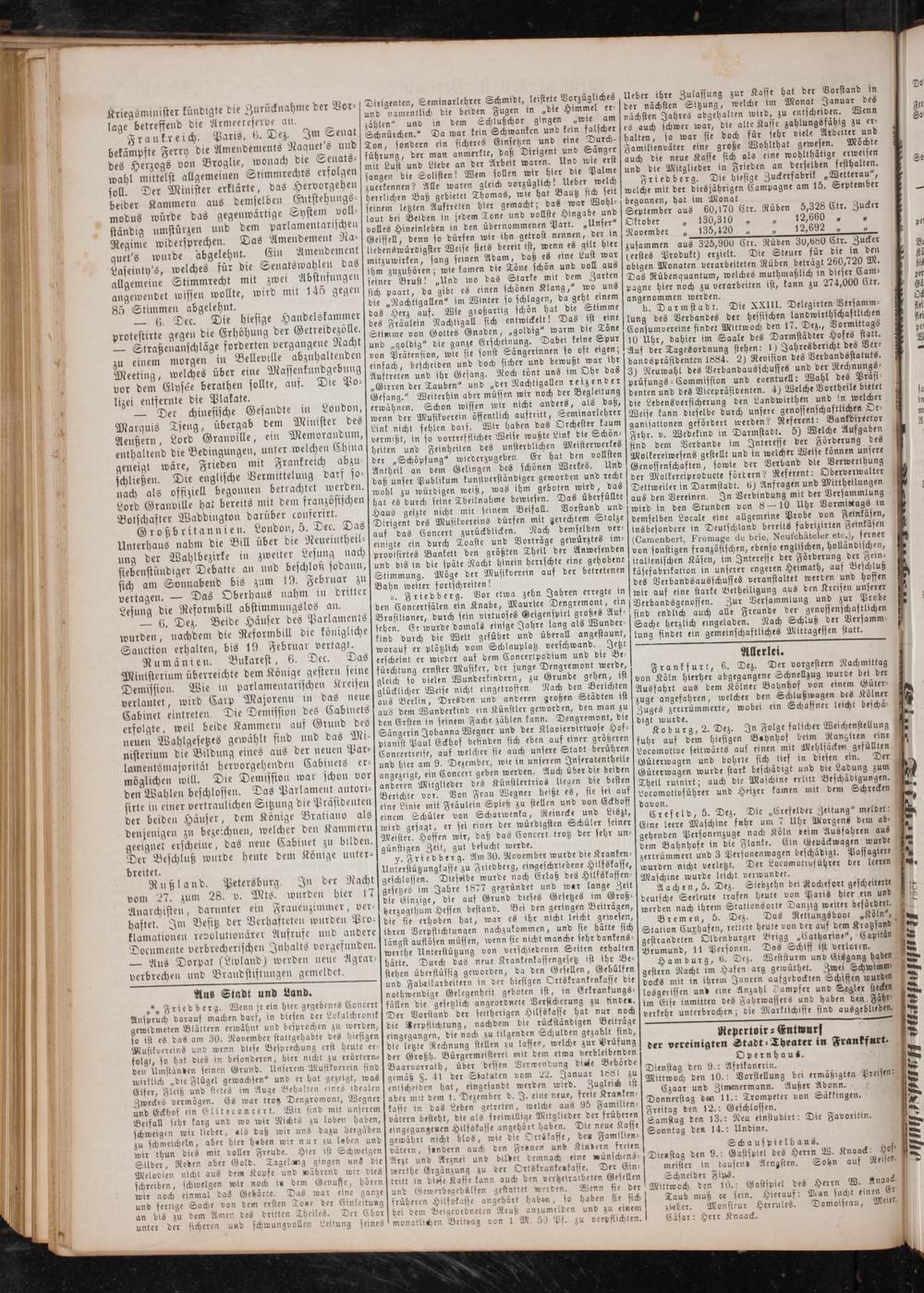 Ueber ihre Zulassung zur Kasse hat der Vorstand in der nächsten Sitzung, welche im Monat Januar des nächsten Jahres abgehalten wird, zu entscheiden. Wenn es auch schwer war, die alte Kasse zahlungsfähig zu er— halten, so war sie doch für sehr viele Arbeiter und Familienväter eine große Wohlthat gewesen. Möchte auch die neue Kasse sich als eine wohlthätige erweisen und die Mitglieder in Frieden an derselben festhalten. Friedberg. Die hiesige Zuckerfabrik„Wetterau“, welche mit der diesjährigen Campagne am 15. September begonnen, hat im Monat September aus 60,170 Ctr. Rüben 5,328 Ctr. Zucker Oktober„ 130,310„„ 9 November„ 135,420„ 5 12818 8 zusammen aus 325,900 Ctr. Nüden 30,680 Ctr. Zucker (erstes Produkt) erzielt. Die Steuer für die in den obigen Monaten verarbeiteten Rüben beträgt 260,720 M. Das Rübenquantum, welches muthmaßlich in dieser Cam⸗ pagne hier noch zu verarbeiten ist, kann zu 274,000 Ctr. angenommen werden. h. Darmstadt. Die XXIII. Delegirten Versamm⸗ lung des Verbandes der hessischen landwirthschaftlichen Consumvereine findet Mittwoch den 17. Dez., Vormittags 10 Uhr, dahier im Saale des Darmstädter Hofes statt. Auf der Tagesordnung stehen: 1) Jahresbericht des Ver⸗ bandspräsidenten 1884. 2) Revision des Verbandsstatuts. 3) Neuwahl des Verbandausschusses und der Rechnungs- prüfungs⸗Commission und eventuell: Wahl des Präsi⸗ denten und des Vicepräsidenten. 4) Welche Vortheile bietet die Lebens versicherung den Landwirthen und in welcher Weise kann dieselbe durch unsere genossenschaftlichen Or⸗ ganisationen gefördert werden? Referent: Bankdireetor Frhr. v. Wedekind in Darmstadt. 5) Welche Aufgaben sind dem Verbande im Interesse der Förderung des Molkereiwesens gestellt und in welcher Weise können unsere Genossenschaften, sowie der Verband die Verwerthung der Molkereiproducte fördern? Referent: Oberverwalter Dettweiler in Darmstadt. 6) Anfragen und Mittheilungen aus den Vereinen. In Verbindung mit der Versammlung wird in den Stunden von 8— 10 Uhr Vormittags in demselben Locale eine allgemeine Probe von Feinkäsen, insbesondere in Deutschland bereits fabrizirten Feinkäsen (Camenbert, Fromage de brie, Neufchäteler etc.), ferner von sonstigen französischen, ebenso englischen, holländischen, italienischen Käsen, im Interesse der Förderung der Fein⸗ käsefabrikation in unserer engeren Hesmath, auf Beschluß des Verbandsausschusses veranstaltet werden und hoffen wir auf eine starke Betheiligung aus den Kreisen unserer Verbandsgenossen. Zur Versammlung und zur Probe sind endlich auch alle Freunde der genossenschaftlichen Sache herzlich eingeladen. Nach Schluß der Versamm— lung findet ein gemeinschaftliches Mittagessen statt.