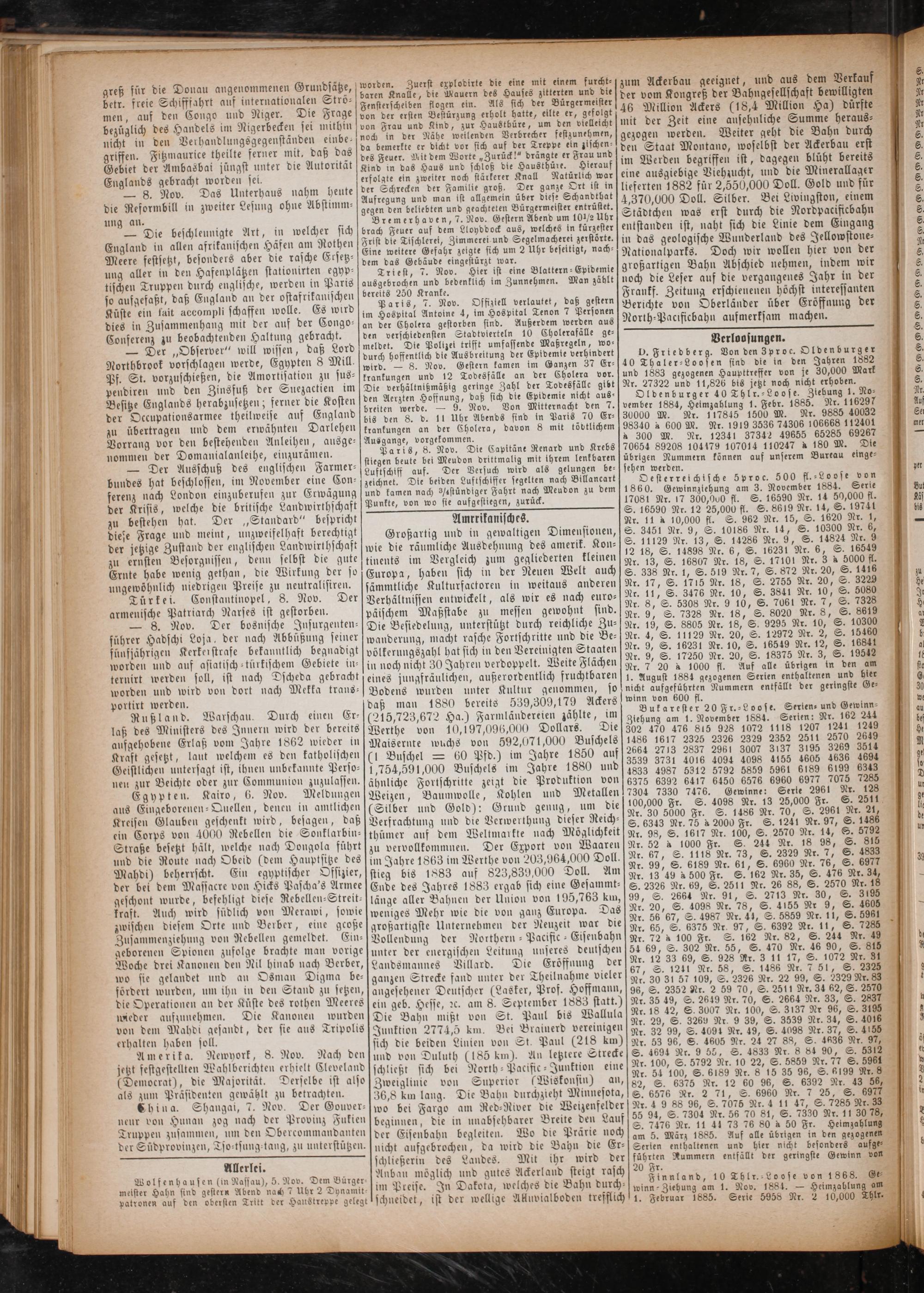 Amerika. Newyork, 8. Nov. Nach den jetzt festgestellten Wahlberichten erhielt Cleveland (Democrat), die Majorität. Derselbe ist also als zum Präsidenten gewählt zu betrachten.