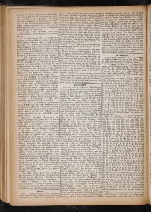 Egypten. Kairo, 6. Nov. Meldungen aus Eingeborenen-Quellen, denen in amtlichen Kreisen Glauben geschenkt wird, besagen, daß ein Corps von 4000 Rebellen die Sonklarbin— Straße besetzt hält, welche nach Dongola führt und die Route nach Obeid(dem Hauptsitze des Mahdi) beherrscht. Ein egyptischer Osfsizier, der bei dem Massacre von Hicks Pascha's Armee geschont wurde, befehligt diese Rebellen-Streit— kraft. Auch wird südlich von Merawi, sowie zwischen diesem Orte und Berber, eine geoße Zusammenziehung von Rebellen gemeldet. Ein⸗ geborenen Spionen zufolge brachte man vorige Woche drei Kanonen den Nil hinab nach Berber, wo sie gelandet und an Osman Digma be— fördert wurden, um ihn in den Stand zu setzen, die Operationen an der Küste des rothen Meeres wieder aufzunehmen. Die Kanonen wurden von dem Mahdi gesandt, der sie aus Tripolis erhalten haben soll.