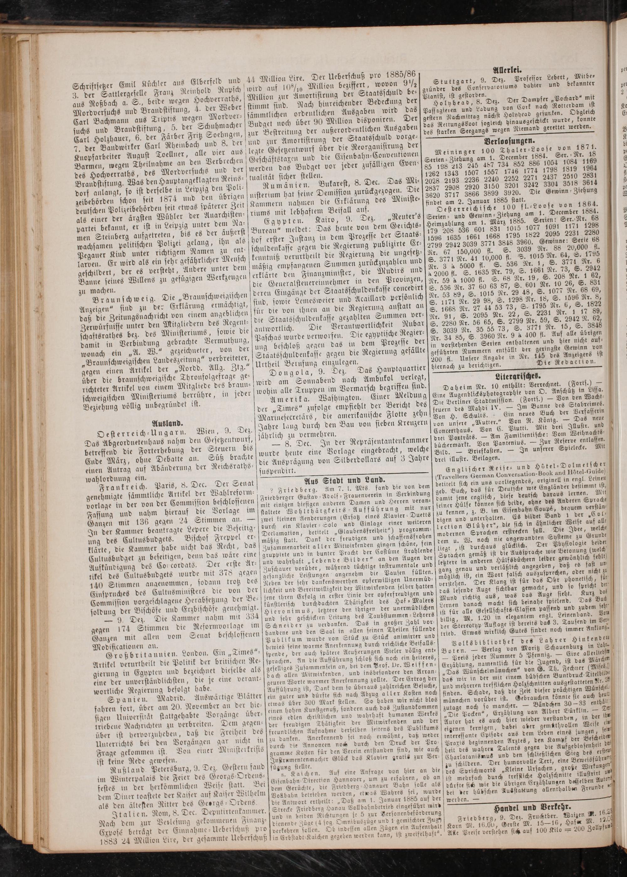 Frankreich. Paris, 8. Dec. Der Senat genehmigte sämmtliche Artikel der Wahlreform— vorlage in der von der Commission beschlossenen Fassung und nahm hierauf die Vorlage im Ganzen mit 136 gegen 24 Stimmen an.— In der Kammer beantragte Lepere die Beseitig— ung des Cultusbudgets. Bischof Freppel er— klärte, die Kammer habe nicht das Recht, das