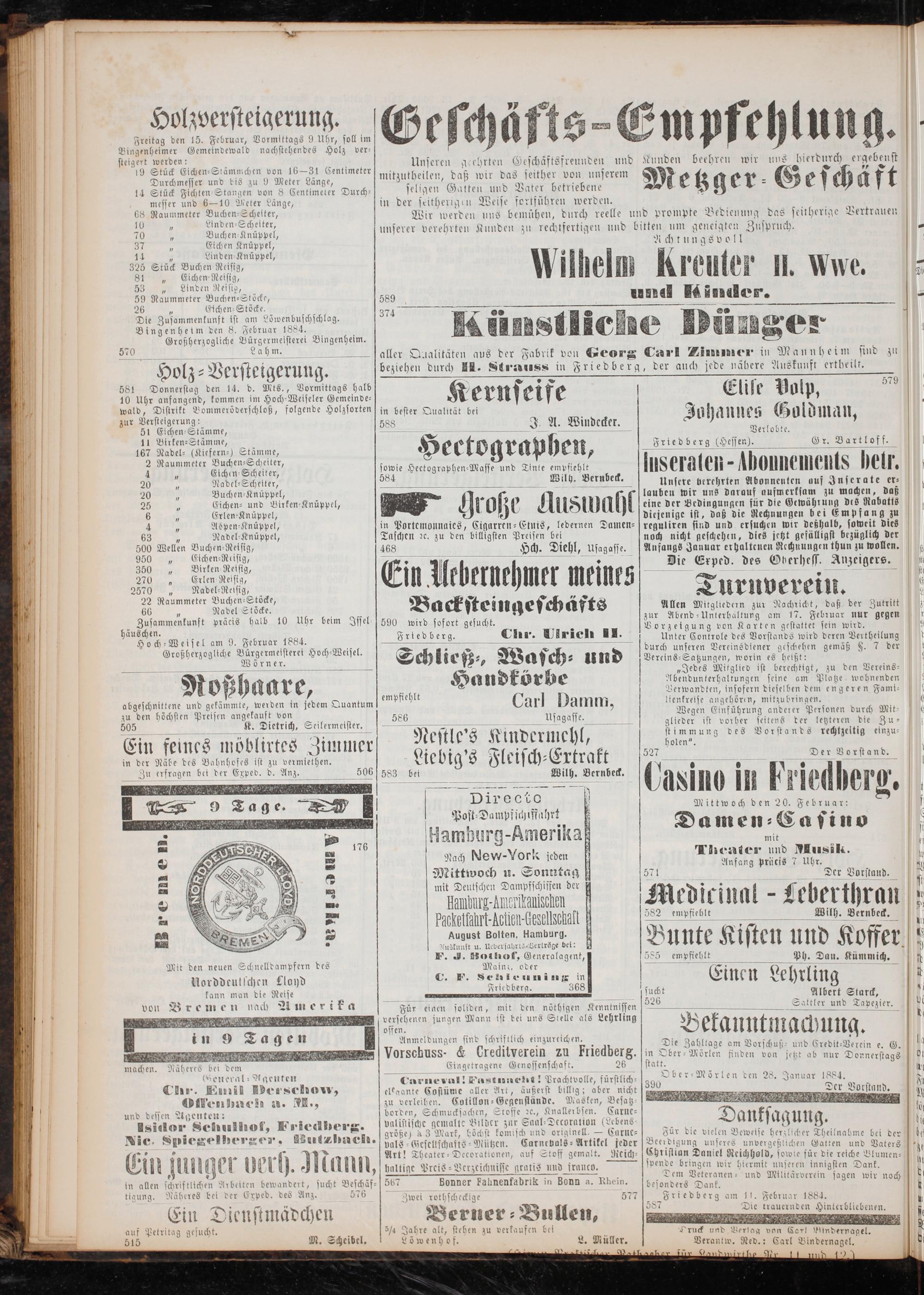 August Bolten, Hamburg. Nuslunft u. Uebersahrts-Verlräge bei: F. J. BWot hof, Generalagent, offen. Anmeldungen sind schriftlich einzureichen. Vorschuss-& Creditverein zu Friedberg.