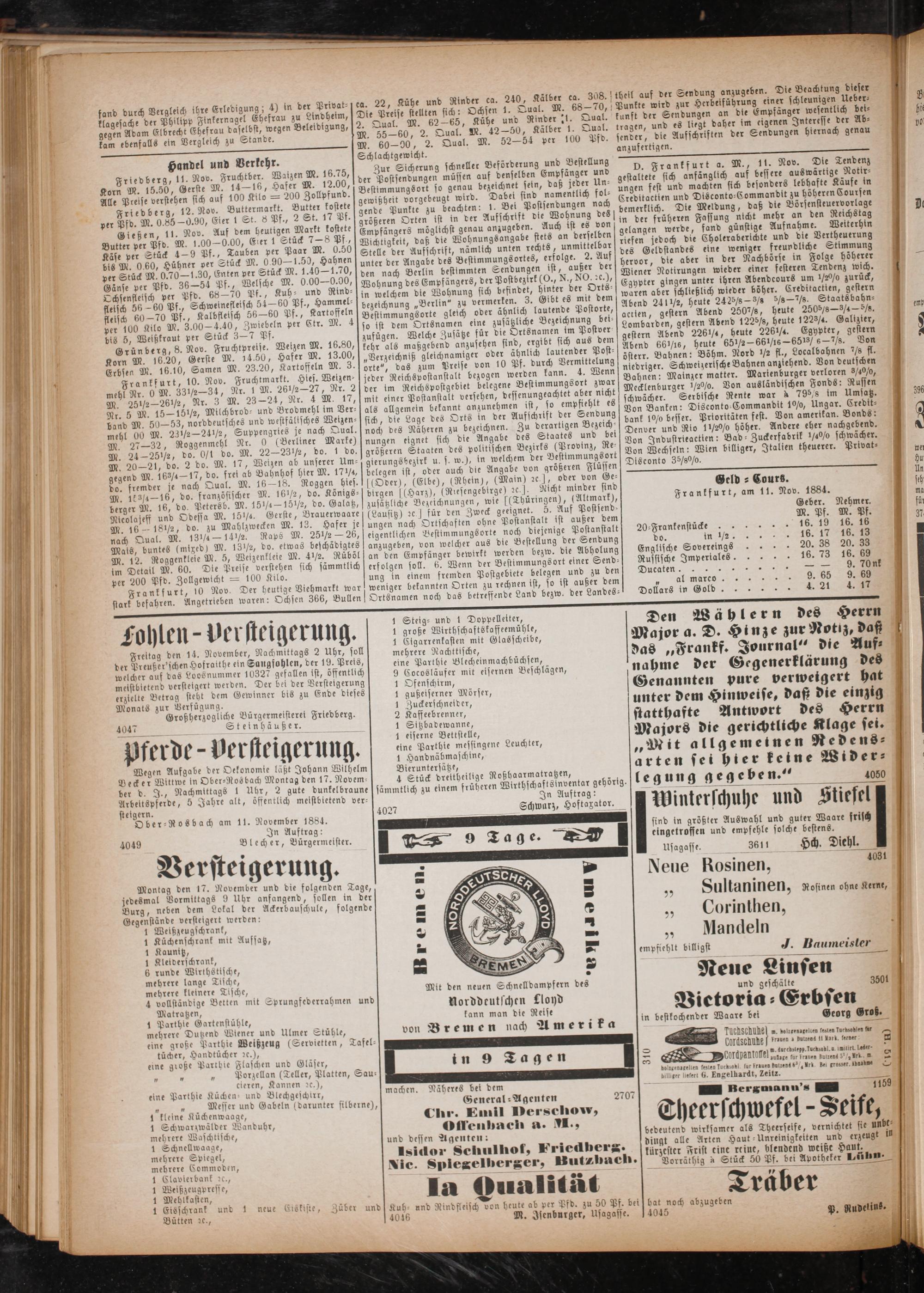 Geld ⸗ Cours. Frankfurt, am 11. Nov. 1884.