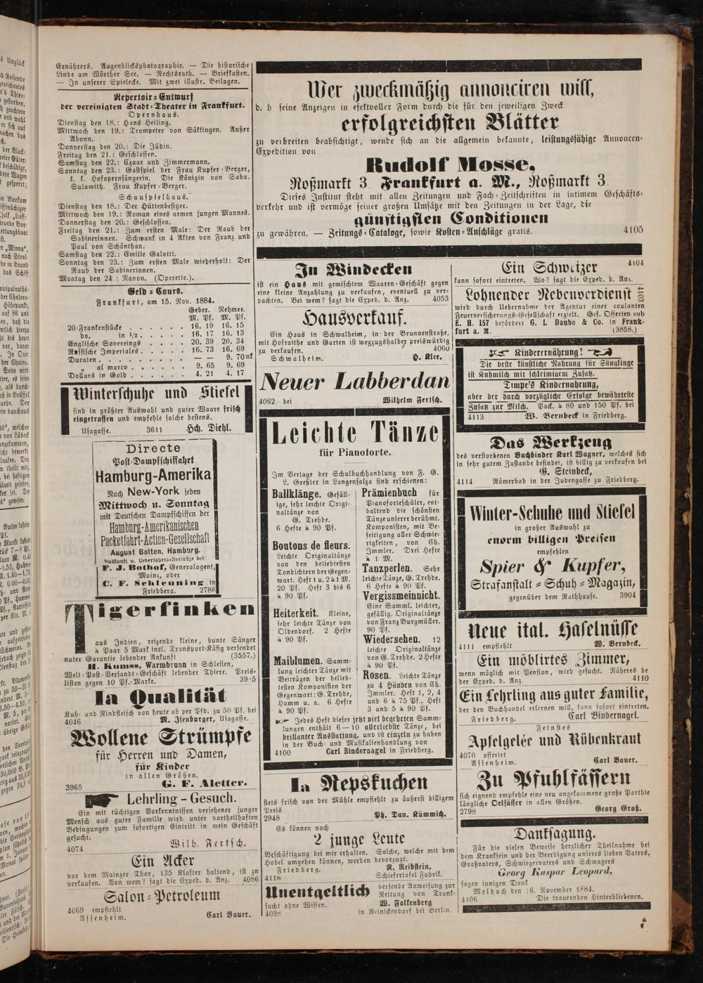 Geld ⸗ Cours. Frankfurt, am 15. Nov. 1884. Geber. Nehmer. M. Pf. M. Pf. „ e e e e 18. 1 16 18 20. 39 20. 34 16. 73 16. 69