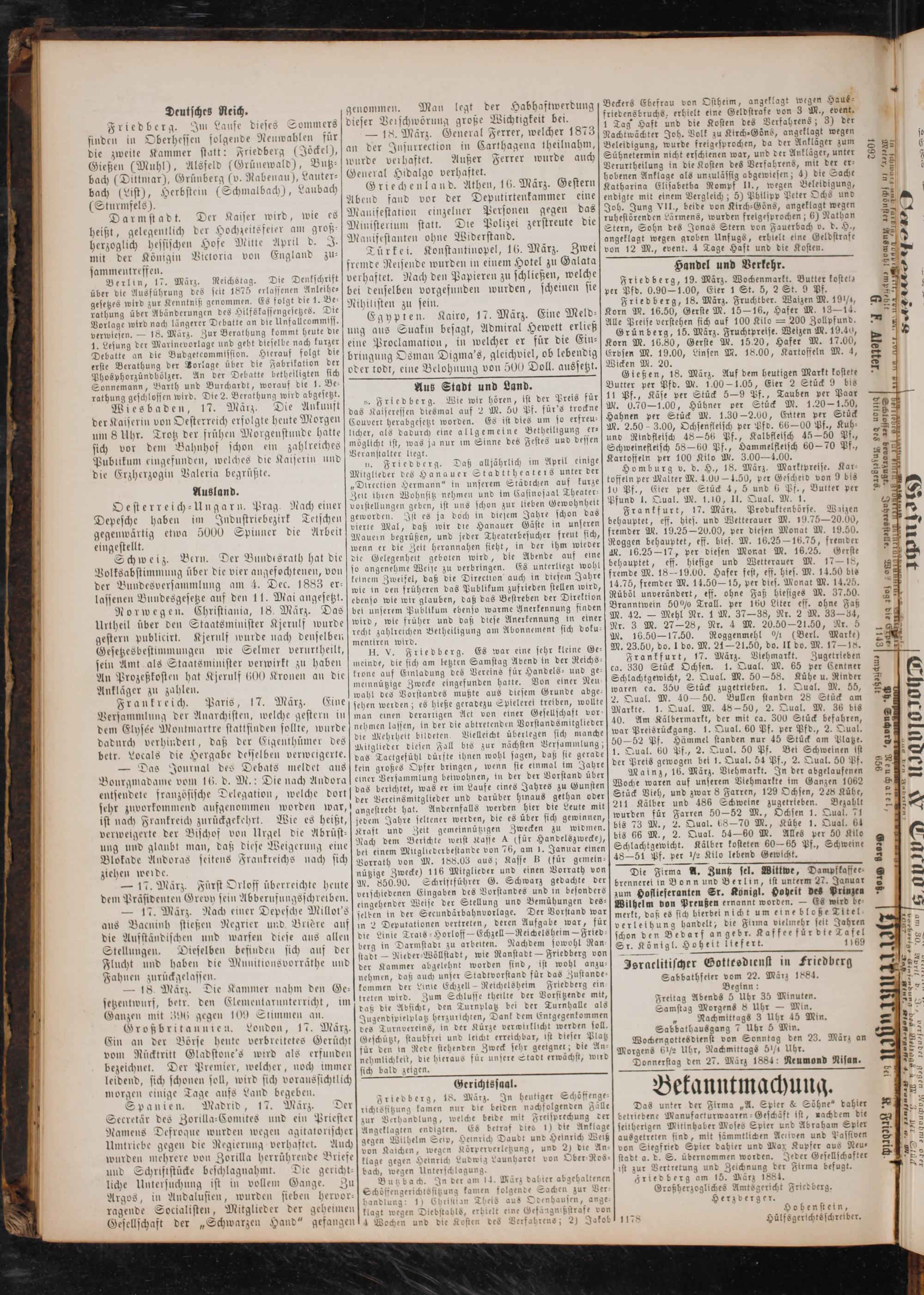 Jsraclitischer Gotteedienst in Friedberg Sabbathfeier vom 22. März 1884. Beginn: Freitag Abends 5 Uhr 35 Minuten. Samstag Morgens 8 Uhr— Min. 5 Nachmittags 3 Uhr 45 Min. Sabbathausgang 7 Uhr 5 Min. Wochengottesdienst von Sonntag den 23. März an Morgens 6½ Uhr, Nachmittags 5¼ Uhr. Doanerstag den 27. März 1884: Neumond Nisan.