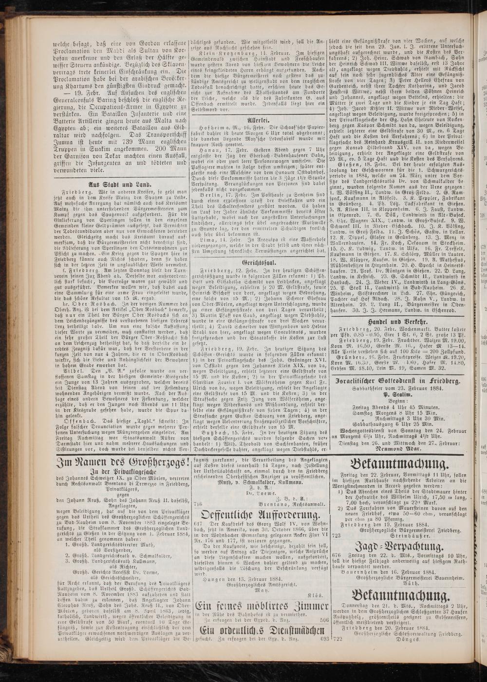 Jsraclitischer Gottesdienst in Friedberg. Sabbathfeler vom 23. Februar 1884. P. Stalim. Beginn: Freitag Abends 4 Uhr 45 Minuten. Samstag Morgens 8 Uhr 15 Min. 4 Nachmittags 3 Uhr 30 Min. Sabbathausgang 6 Uhr 25 Min. Wochengottesdienst von Sonntag den 24. Februar an Morgens 6% Uhr, Nachmittags 4½ Uhr. Dienstag den 26. und Mittwoch den 27. Februar: Neumond Adar.