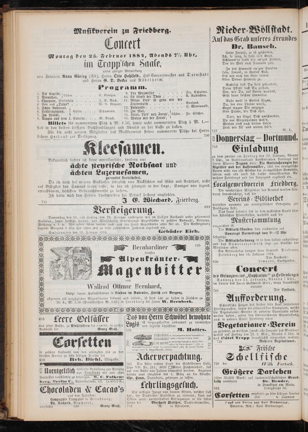 eingerichtet ist. Die Bibliothekstunden sind einstweilen auf Sonntags Vormittags von 9—12 Uhr festgesetzt. 5 Die Bibliothekordnung ist in dem Lokale ausgehängt und das Bücherverzeichniß liegt zur Einsicht der Mitglieder offen.. Als Bibliothekar fungirt Herr Architekt Diesener. Friedberg den 15. Februar 1884. Der Vorstand: Limpert, Vorsitzender.