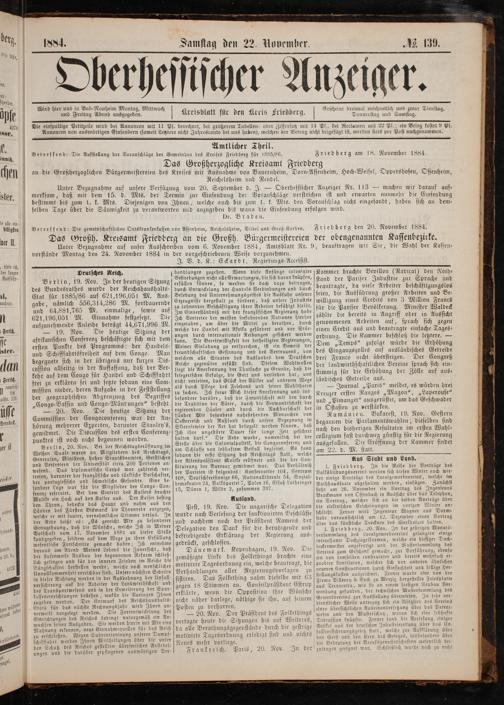 Das Großh. Kreisamt Friedberg an die Großh. Bürgermeistereien der obengenannten Kassenbezirke. 5 Unter Bezugnahme auf unser Ausschreiben vom 6. November 1884, Amtsblatt Nr. 9, beauftragen wir Sie, die Wahl der Kassen— vorstände Montag den 24. November 1884 in der vorgeschriebenen Weise vorzunehmen.
