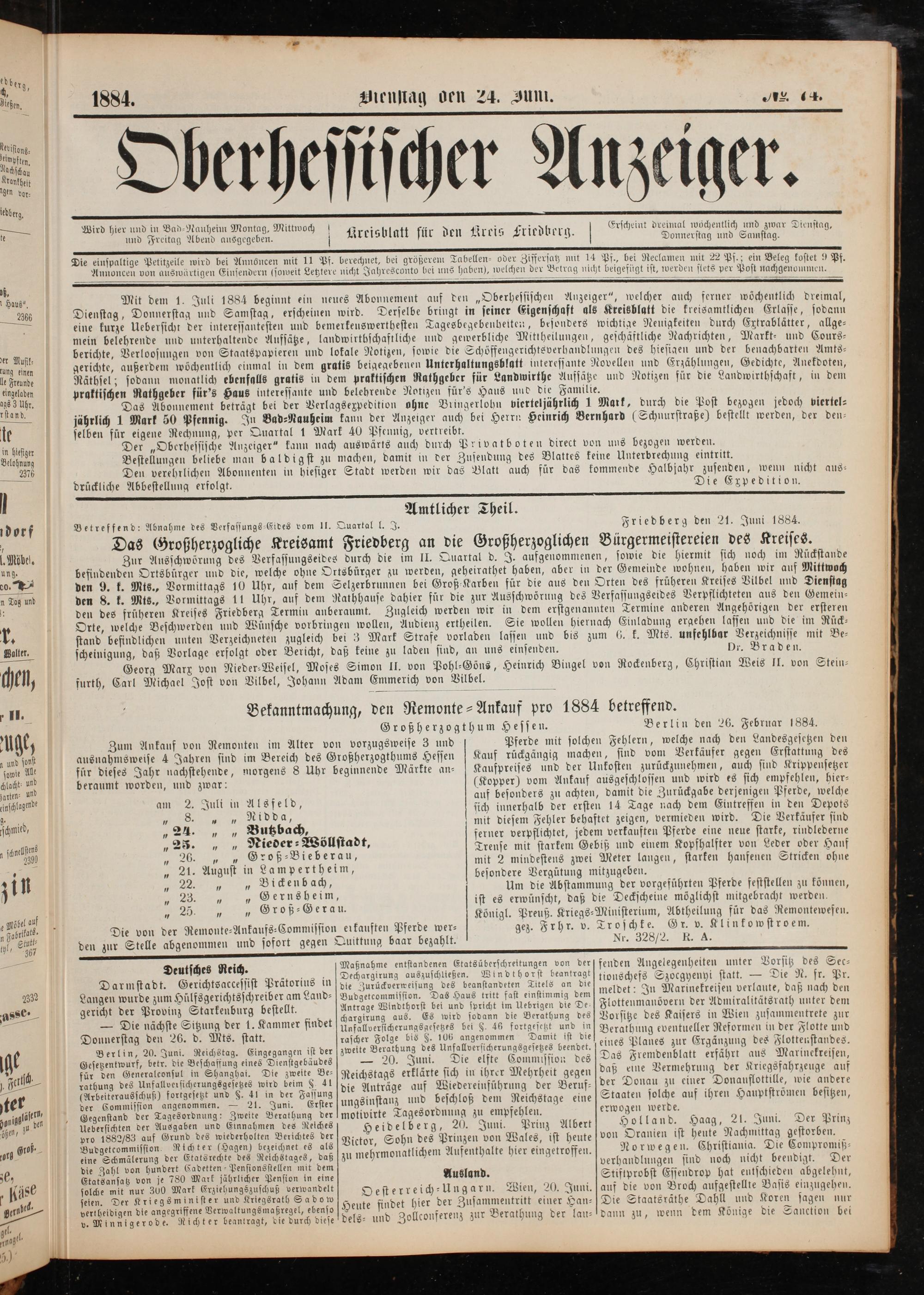 Mit dem 1. Juli 1884 beginnt ein neues Abonnement auf den„Oberhessischen Anzeiger“, welcher auch ferner wöchentlich dreimal,