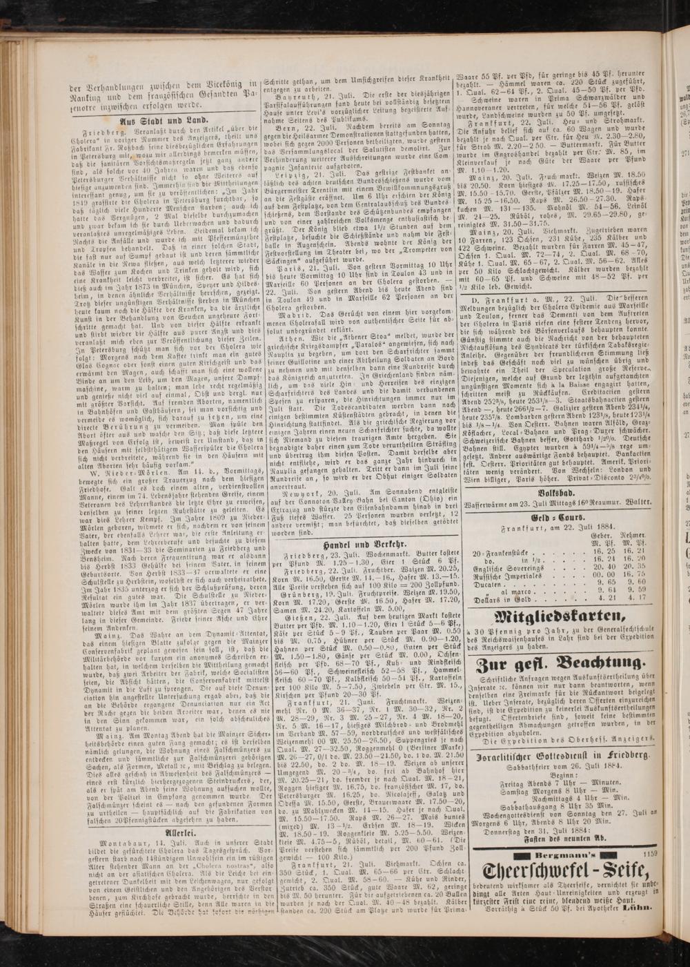 Anleihe. Gegenüber der freundlicheren Stimmung ließ 1 indeß das Geschäft noch viel zu wünschen übrig und 0 bewahrte ein Theil der Speculation große Reserves 0 Diejenigen, welche auf Grund der letzthin aufgetauchten ungünstigen Momente sich à la Baisse engagirt hatten, 0 schritten meist zu Rückkäufen. Creditaetien gestern Abend 2523/8, heute 253/—3. Staatsbahnagetien gestern hab Abend—, heute 266½—7. Galizier gestern Abend 234½, ebe heute 235 /. Lombarden gestern Abend 128¼, heute 123½ an bis/- ½. Von Oesterr. Bahnen waren Alföld, Graz— Köflacher, Local-Vahnen und Prag ⸗Duxer schwächer. 8 Schweizerische Bahnen besser, Gotthard ½0%. Deutsche 2 Bahnen still. Egypter wurden 4 59¼—‘8 rege um: gesetzt. Andere auswärtige Fonds behauptet. Bankaetien fest. Oesterr. Prioritäten gut behauptet. Amerik. Priori⸗ täten wenig verändert. Von Wechseln: London und Wien billiger, Paris höher. Privat⸗Disconto 28/0%0. d 9 Volksbad. al Wasserwärme am 23. Jull Mittags 16 Reaumur. Walter. 1 2 Geld⸗ Cours. Frankfurt, am 22. Jult 1884. 20 Geber. Nehmer— J M. Pf. M. Pf. 20⸗Frankenstücke. 16. 25 16, 0 do. in% 8 Englische Sovereings.. 20. 40 20. 35 J Russische Imperiales 00. 00 16. 75 b Dualen„„. 68 — ab mrs 7 Dollars in Bold. 4. 21 f Mitgliedskarten, à 30 Pfennig pro Jahr, zu der Generalfechtschule N des Reichswaisenhauses in Lahr sind bei der Expeditlon des Anzeigers zu haben. Zur gefl. Beachtung. Schriftliche Anfragen wegen Auskunftsertheilung über Inserate ꝛe. können wir nur dann beantworten, wenn denselben eine Freimarke für die Rückantwort belgelegt ist. Ueber Inserate, bezüglich deren Offerten einzureichen sind, ist die Expedition zu keinerlei Auskunftserthellungen befugt. Offertenbriese sind, soweit keine bestimmten 0 gegentheiligen Abmachungen getroffen wurden, in der 8 Expedition abzuholen. 0 Die Expedition des Oberhess. Anzeigers, a