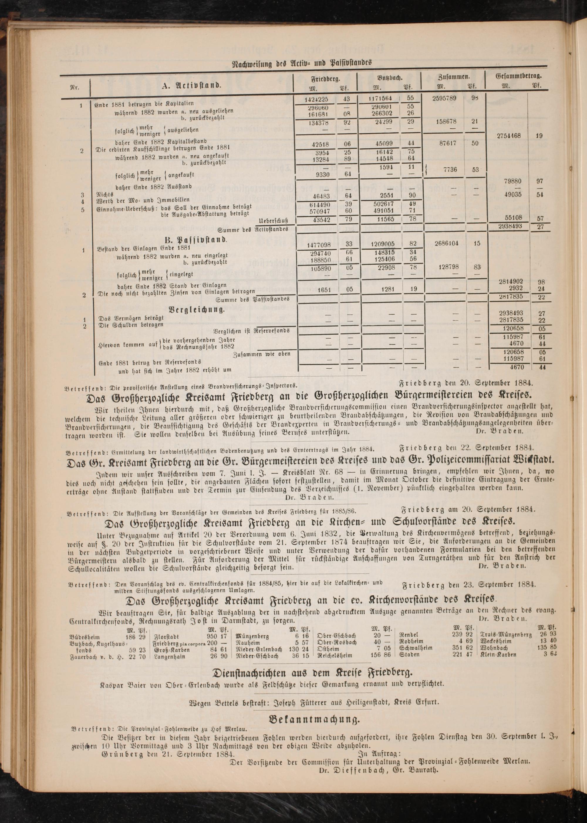 Betreffend: Die Aufstellung der Voranschläge der Gemeinden des Kreises Friedberg für 1885/86. Friedberg am 20. September 1884.