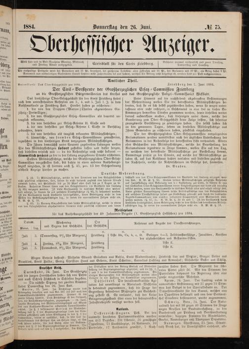 Das diesjährige Ober-Ersatzgeschäft für den Kreis Friedberg findet nach dem untenstehenden Reiseplan am 3., 4. und 5. Juli l. J. in dem Hierbei haben zu erscheinen: