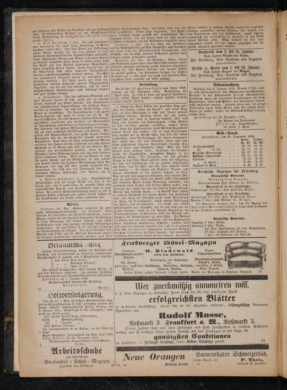 1. können, um f Kränze mitnehmen in den dunklen Schoos der Erde. 2 leichter hinweg. Aber es will uns angezeigt erscheinen, diese ehrende Mit⸗ i 1 a. Nieder⸗Florstadt, 2. Jan. Eigenthümliche 11 unbetlosse n Greis dessen Lebens chf Evangelische Gemeinde. Erfahrungen muß ein junger Mann von hier in der 5 loboen. e S umschiffte schf Sonntag nach Neujahr. N kurzen Zeit, als er verheirathet ist, gemacht haben und 8 ö 8 Reung ffte, der Pfarramtswoche Herr Pfarrer Dr. Köstlin igentbümliche Begriffe vom Standesamt muß er auch Firlebens Ae Kampf ums Dasein führen mußte, aus⸗. 85 0 N 5 Am 3 Weihnachts feiertage ü enen eee bat; wenn die von der Last der Jahre gebeugte 9. 1 K r in 175„ 1 5 8. 2 Wittwe das Zeitliche segnet,— in Betreff ihrer bedarf Nachmittags 1¼ Uhr: Herr Candidat Wahl. 5 Hymens Fesseln geschlogen und gestern bereits erschlen er es unseres Grachtens der holden Kinder des Früblings Gottesdienst in der Burgkirche: am Standesamte und wollte wieder geschieden sein 4 9 urgkirche 1— 0 nicht; wir ehren ihr Andenken durch ernste Betrachtung Vormittags 9½ Uhr: Herr Kirchenrath Baur. 1 Allerlei der Wege, die sie gewandelt, durch richtige Würdigung Abends 5 Uhr: Herr Pfarrer Dr. Diegel. er el. f 8 i des Guten, das sie geschaffen. Die Sache von diesem Die Redaction bedauert sehr, daß die Anzeige des f 5 London, 30. Dec. Gestern ereigneten sich zwei Gesichtspunkte aus betrachtet, hat es uns auch nur an⸗ Sylvester⸗Gottesdienstes in Folge eines Irrthums 1 ernste Eisenbahnzusammenstöße. In Crownest, einer genehm berührt, wenn in der Neuzeit Angehörige der in der Druckerei unterblieben ist. 1 Station der Lancasbire und Poiksbire Eisenbahn, unweit Dabingeschiedenen, ja Sterbende selbst den Wunsch aus⸗ 6 Wigan, rannte ein von Liverpool kommender Personenzug sprachen, die Blumenspende zu unterlassen. Bei Werken e 1 in einen Kohlenzug mit solcher Gewalt, daß gegen der Pietät, wie den bier erwähnten, soll der Kostenpunkt Katholische Gemeinde. * 24 Passagiere mehr oder weniger erhebliche Verletzungen keiner besonderen Erwähnung geschehen, indessen darf Samstag 5 Uhr: Beicht. ö davontrugen. In zwel Fällen ist ein tödtlicher Ausgang doch wohl der Hinwels gestattet sein, daß die in unserem] Sonnta 6 Uhr: Beicht. der Verwundungen zu besorgen. Die zweite Collision 5 Falle für die Todten ausgegeben werdenden Beträge 8 217 Uhr: Ausheilung der Hell. Poze Abends nach 6 Ubr auf der Midland Elsenbahn unweit manchem Lebenden zu Gute kommen, daß namentlich 10 Uhr: Hochamt mit Predigt. der Station Camdenroad(London) zwischen zwei stark verschämte Arme damit erfreut werden könnten. In unserer 2 Ubr: Christenlebre und Andacht. 5 0 N 9 4 5 6 1 a Betaunulmadhülg Friedberger WMöbel⸗Magazin — 2 2 von nfolge Statutenänderung besteht der Vorstand des N 3 N 5 5 nd eee u Friedberg(eingetragene cz Complete 5 H. Bin dewald Eigene Vorschuß. u ins zu Friedberg(eingetrag Einrichtungen in jeder 8 Tapezi Genossenschaft) in Zukunft aus 3 Mitgliedern, nämlich: Holzart neben dem Rathhaus. Tapezierwerkstatt. 35 5 7 7 K 2 3 J. dem Herrn Fritz 5 1 85 Anfertigung und Aufmachen Garnituren, Canapès,; 3 Alle Sorten von Divan's, Sessel, 5 N e olirte, lackirte Vorhängen, i äthi ü 0 Der frühere Ersatzbeamie, Herr Ludwig Weis, ist 5 Möbel. i e e e N* 0 aus dem Vorstande geschieden. Zur gültigen Zeichnung Solide Arbeit, größte Aus N 1 l 175 8 0 3 ist die Unterschrift von 2 Vorstands mitgliedern 1* We Arbe, grüße int ee Betten mit Matratzen in Roßbaar, Seegras. 85⁵ 5 Friedberg am 1. Januar 1885. 8 0 5 7 W N 885 een a 5. 5 Großherzogliches Amtsgericht Friedberg.. ö 5 77 Herzberger. ii 1 2 0. i 4 9 FFC Ver zweckmäßig annonciren will, g Holzversteigerung b h. seine Anzeigen in efektvoller Form durch die für den jeweiligen Zweck 1 5 N f** 0 7 a ie am 22. l. Mts. im biest ind 1 Bl tt ö Die am m hiesigen Gemeindewald abge erfo greichsten 11 er