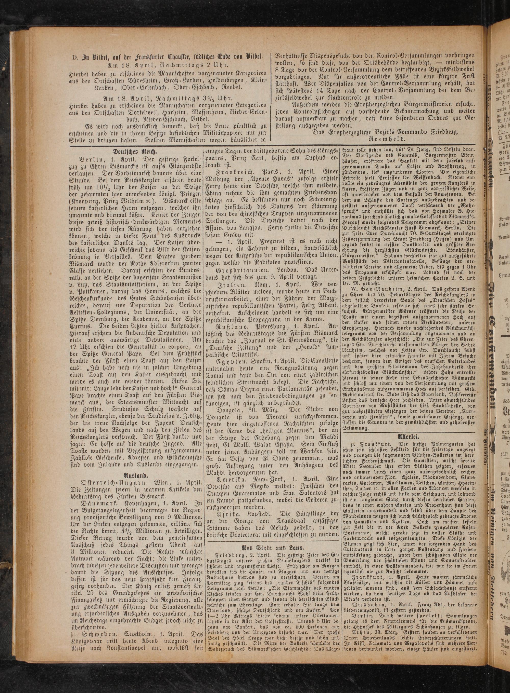 Friedberg, 2. April. Die gestrige Feier des Ge⸗ burtstages unseres großen Reichskanzlers verlief in schöner und angemessener Weise. Früh schon am Morgen bedeckten sich die Häuser mit Flaggen und nur wenige Ausnahmen hiervon sind zu verzeichnen. Bereits am Vormittag ging seitens des„runden Tisches“ folgendes Telegramm nach Berlin:„Die Stammgäste des runden Tisches trinken auf Ew. Durchlaucht Wohl beim Früh⸗ schoppen einen Ganzen und senden die herzlichsten Glück— wünsche zum Ehrentage. Gott erhalte Sie lange dem Vaterland, schütze Deutschland und den Kaiser.“ Von 1—2 Uhr Mittags spielte sodann unsere Dilettanten kapelle in der Allee der Katserstraße. Abends 8 Uhr be⸗ gann das Bankett, das von ca. 400 Personen aus Friedberg und der Umgegend besucht war. Der große Saal des Hötel Trapp war dicht besetzt und schön und sinnig geschmückt. Die Mitte der Gallerie schmückte der Wahrspruch des Bismarck'schen Geschlechts: Das Wege—