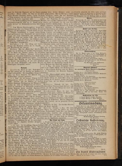 Frankreich. Paris, 30. Juli. Nachrichten aus Hüe zufolge sind die Banden der Aufstän— dischen desorganisirt. Die französischen Truppen haben den Vater Thuyet's, des Führers der Aufständischen, gefangen genommen.