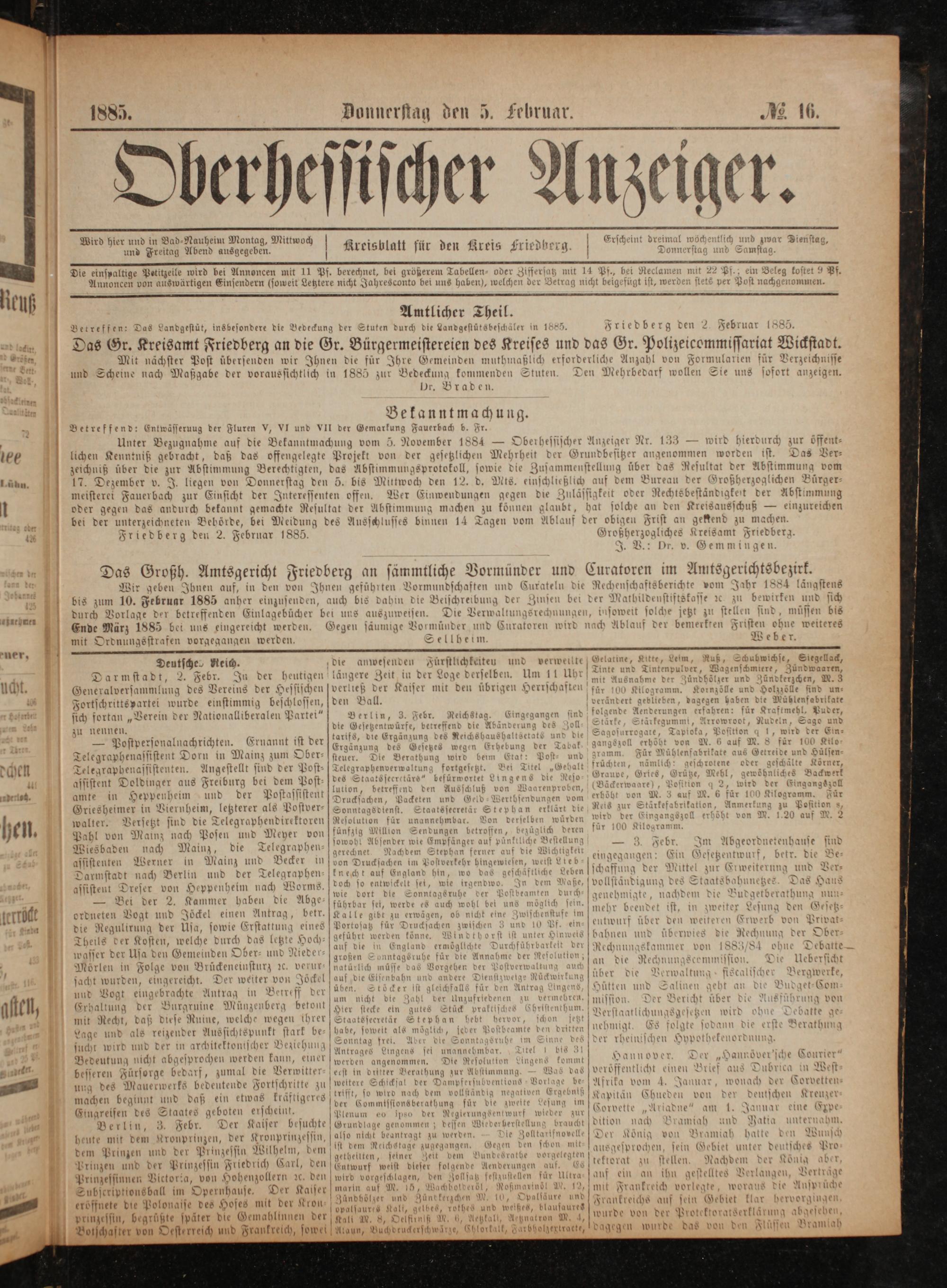 Amtlicher Theil. Betreffen: Das Landgestüt, insbesondere die Bedeckung der Stuten durch die Landgestütsbeschäler in 1885. Friedberg den 2 Februar 1885. Das Gr. Kreisamt Friedberg an die Gr. Bürgermeistereien des Kreises und das Gr. Polizeicommissariat Wickstadt. Mit nächster Post übersenden wir Ihnen die für Ihre Gemeinden muthmaßlich erforderliche Anzahl von Formularien für Verzeichnisse und Scheine nach Maßgabe der voraussichtlich in 1885 zur Bedeckung kommenden Stuten Den Mehrbedarf wollen Sie uns sofort anzeigen. Dr. Braden.