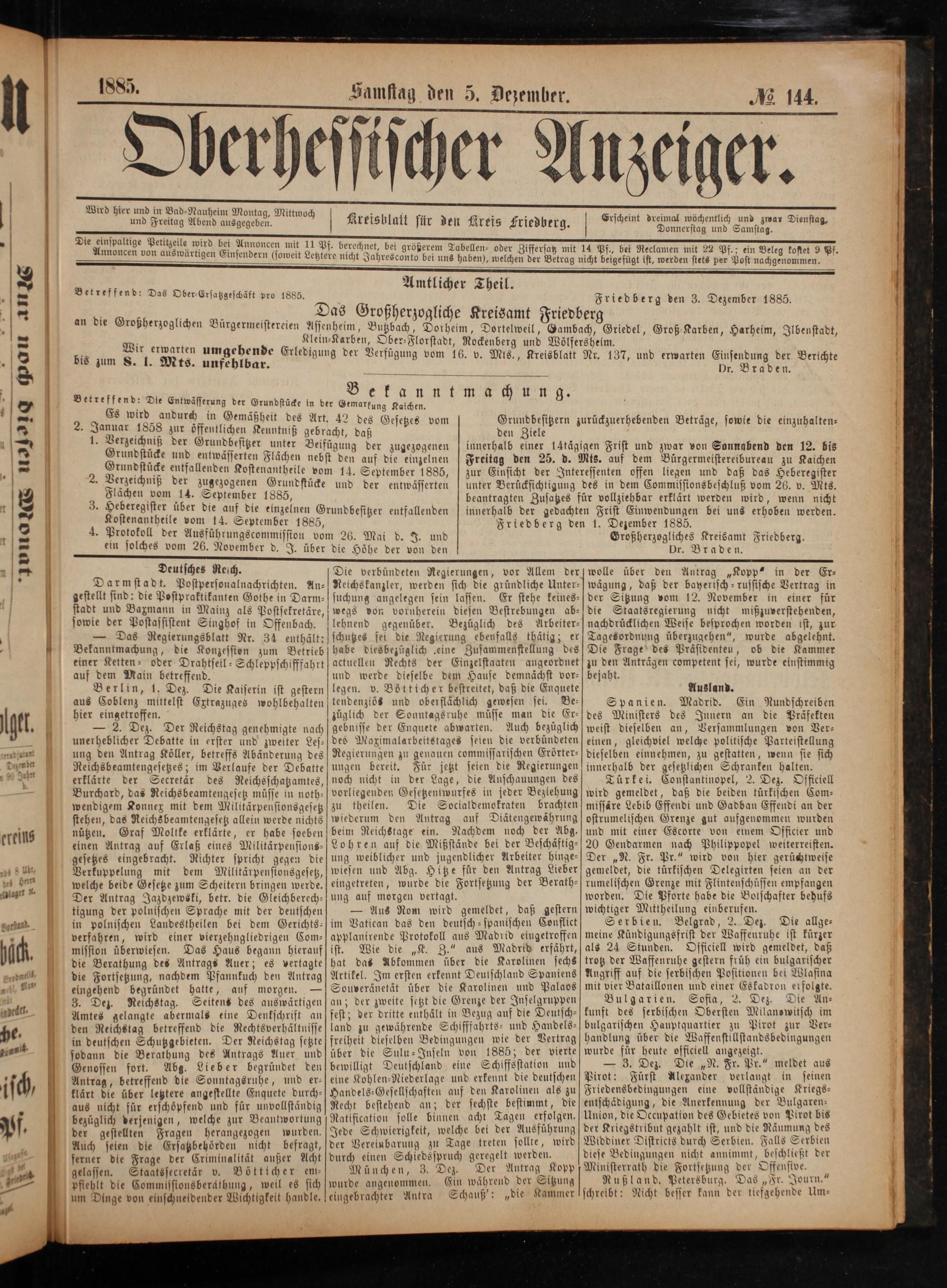 Amtlicher Theil. Friedberg den 3. Dezember 1885.