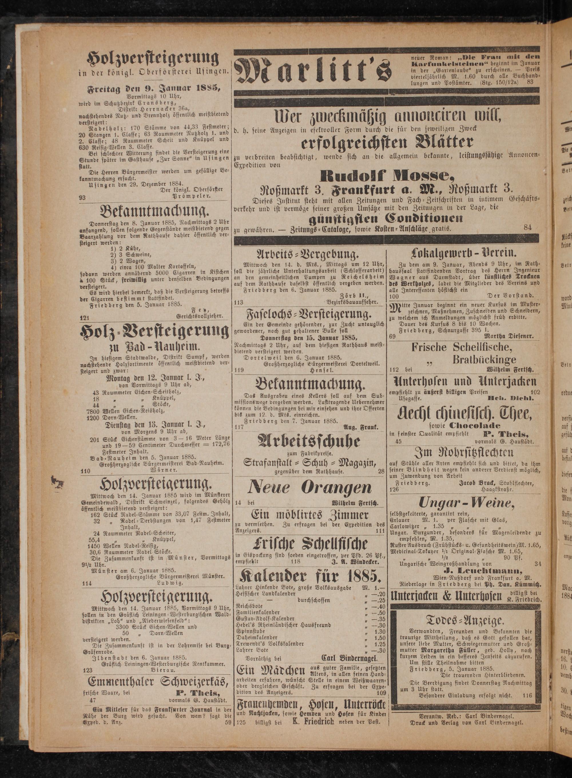 — 80— 5— Arbeits-Vergebung. Mittwoch den 14. d. Mts., Mittags um 12 Uhr, soll die jährliche Unterhaltungsarbeit(Schlosserarbelt) an den gemeinheitlichen Pumpen zu Reichelsheim auf dem Rathhause daselbst öffentlich vergeben werden. Friedberg den 6. Januar 1885. Zörb II., ... ͤvV — 1 2 Faselochs-Versteigerung. Ein der Gemeinde gehörender, zur Zucht untauglich gewordener, noch gut gehaltener Bulle soll Donnerslag den 15. Januar 1885, Nachmittags 2 Uhr, auf dem hlesigen Rathhaus meist— bietend versteigert werden. Dortelweil den 6. Januar 1885.
