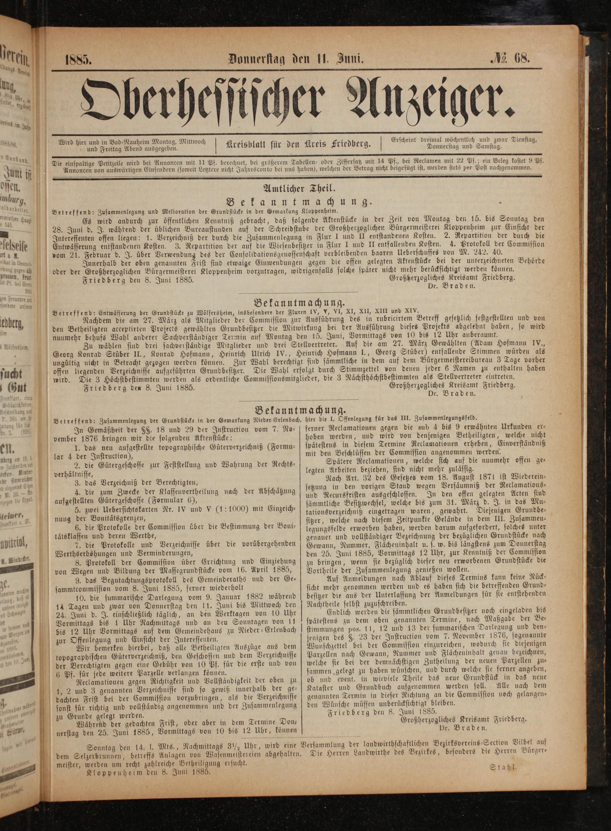 an Friedberg den 8. Juni 1885. Großherzogliches Kreisamt Friedberg. l Dr. Braden. dan Bekanntmachung. Betreffend: Entwässerung der Grundstücke zu Wölfersheim, insbesondere der Fluren IV, V, VI, XI, XII, XIII und XIV. öberg Nachdem die am 27. März als Mitglieder der Commission zur Ausführung des in rubricirtem Betreff gesetzlich festgestellten und von ö den Betheiligten acceptirten Projects gewählten Grundbesitzer die Mitwirkung bei der Ausführung dieses Projekts abgelehnt haben, so wird