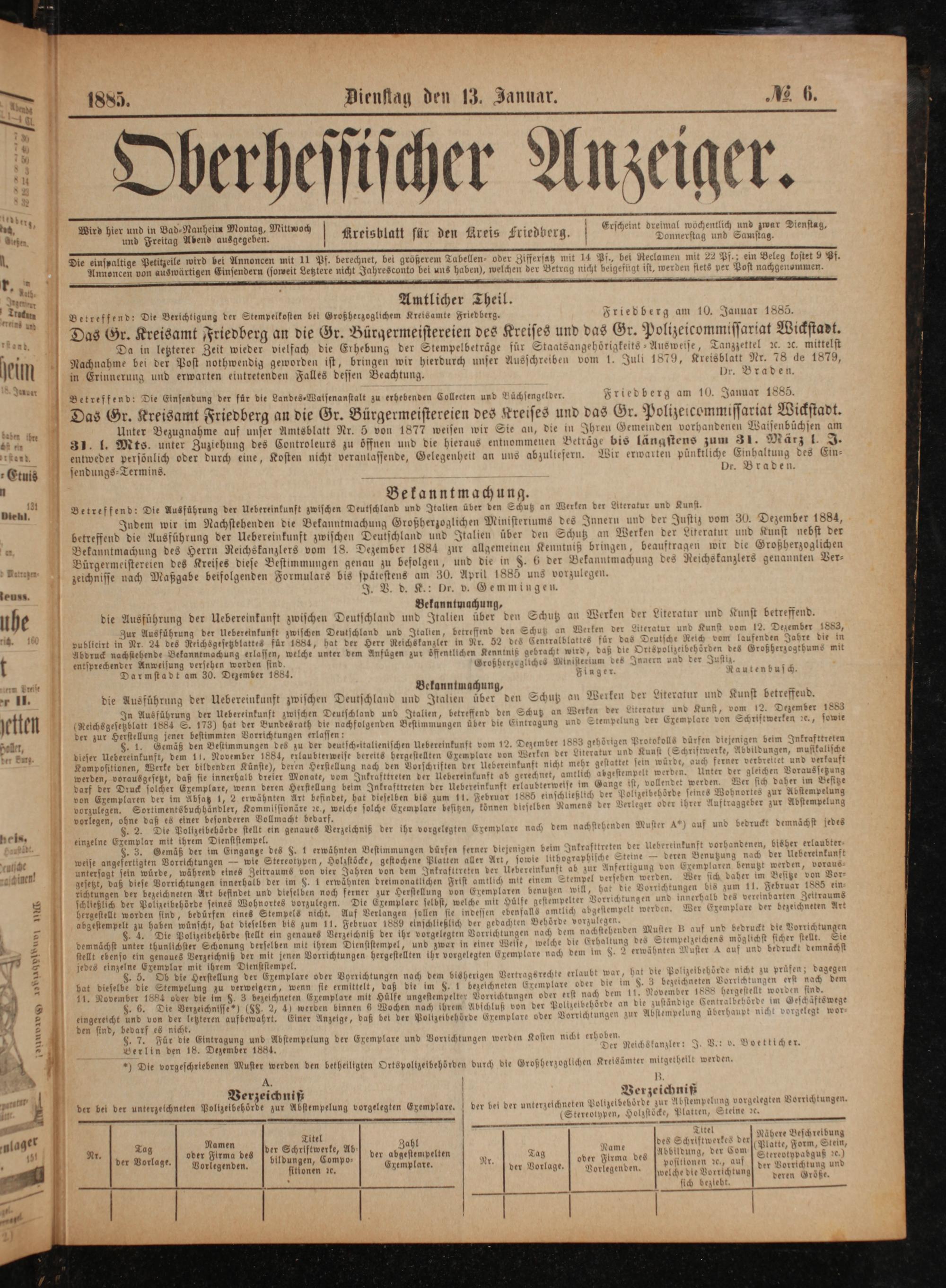 Indem wir im Nachstehenden die Bekanntmachung Großherzoglichen Ministeriums des Innern und der Justiz vom 30. Dezember 1884, betreffend die Ausführung der Uebereinkunft zwischen Deutschland und Italien über den Schutz an Werken der Literatur und Kunst nebst der Bekanntmachung des Herrn Reichskanzlers vom 18. Dezember 1884 zur allgemeinen Kenntniß bringen, beauftragen wir die Großherzoglichen Bürgermeisteretien des Kreises diese Bestimmungen genau zu befolgen, und die in F. 6 der Bekanntmachung des Reichskanzlers genannten Ver⸗ zeichnisse nach Maßgabe beifolgenden Formulars bis spätestens am 30. April 1885 uns vorzulegen.
