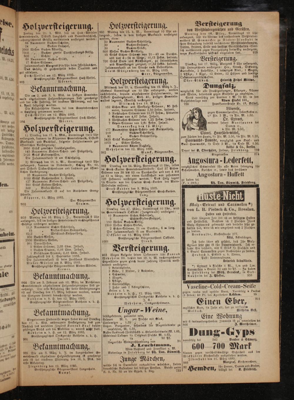 959 Montag den 16. März l. J., Vormittags 9 Uhr anfangend, soll im hiesigen Gemeindewald nachbezeichnetes Gehölze versteigert werden: 11,6 Raummeter Eichen Scheitholz, 19 Birken⸗Elchen-Knüppelholz, 62, 5 Weichlaub⸗Knüppelholz, 950 Buchen⸗Wellen, 3530 Weichholz Wellen, 981 Dorn-⸗Wellen, 5 Eichen Stämme, 2,05 Cbm. Inhalt, 1 Buchen⸗Stamm, 0,06 Cbm. Inhalt, 1 Kirschbaum Stamm, 0,18 Cbm. Inhalt. Zahlungsfrist bis 1. September 1885. Die Zusammenkunft ist beim Forsthaus Winterstein. Nieder⸗Mörlen am 9. März 1885. Großherzogliche Bürgermeisterei Nieder ⸗Mörlen.