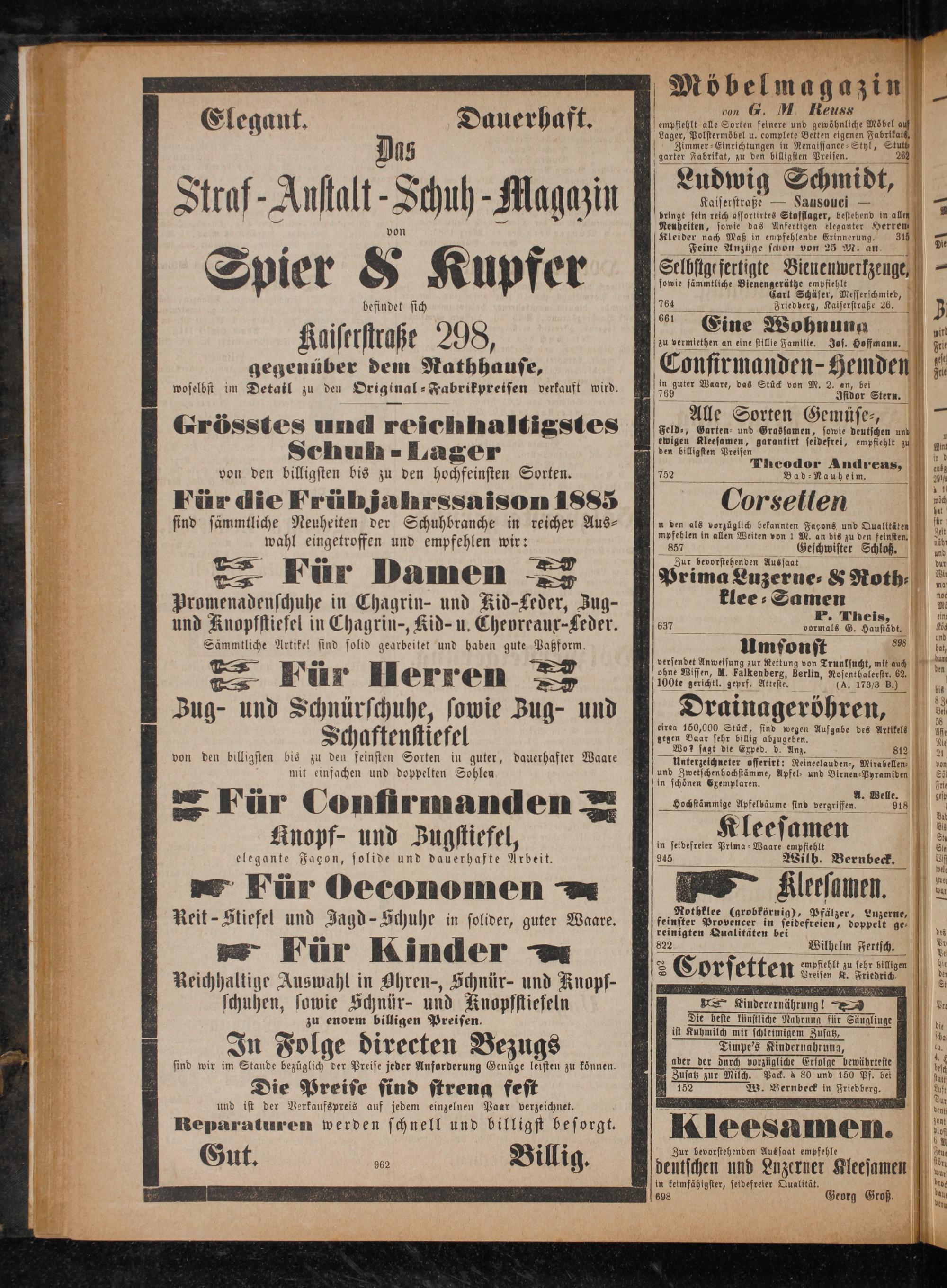 Grösstes und reichhaltigstes Schuh- Lager von den billigsten bis zu den hochfeinsten Sorten. Für die Früh jiahrssaison 1885 find sämmtliche Neuheiten der Schuhbranche in reicher Aus— wahl eingetroffen und empfehlen wir: DN