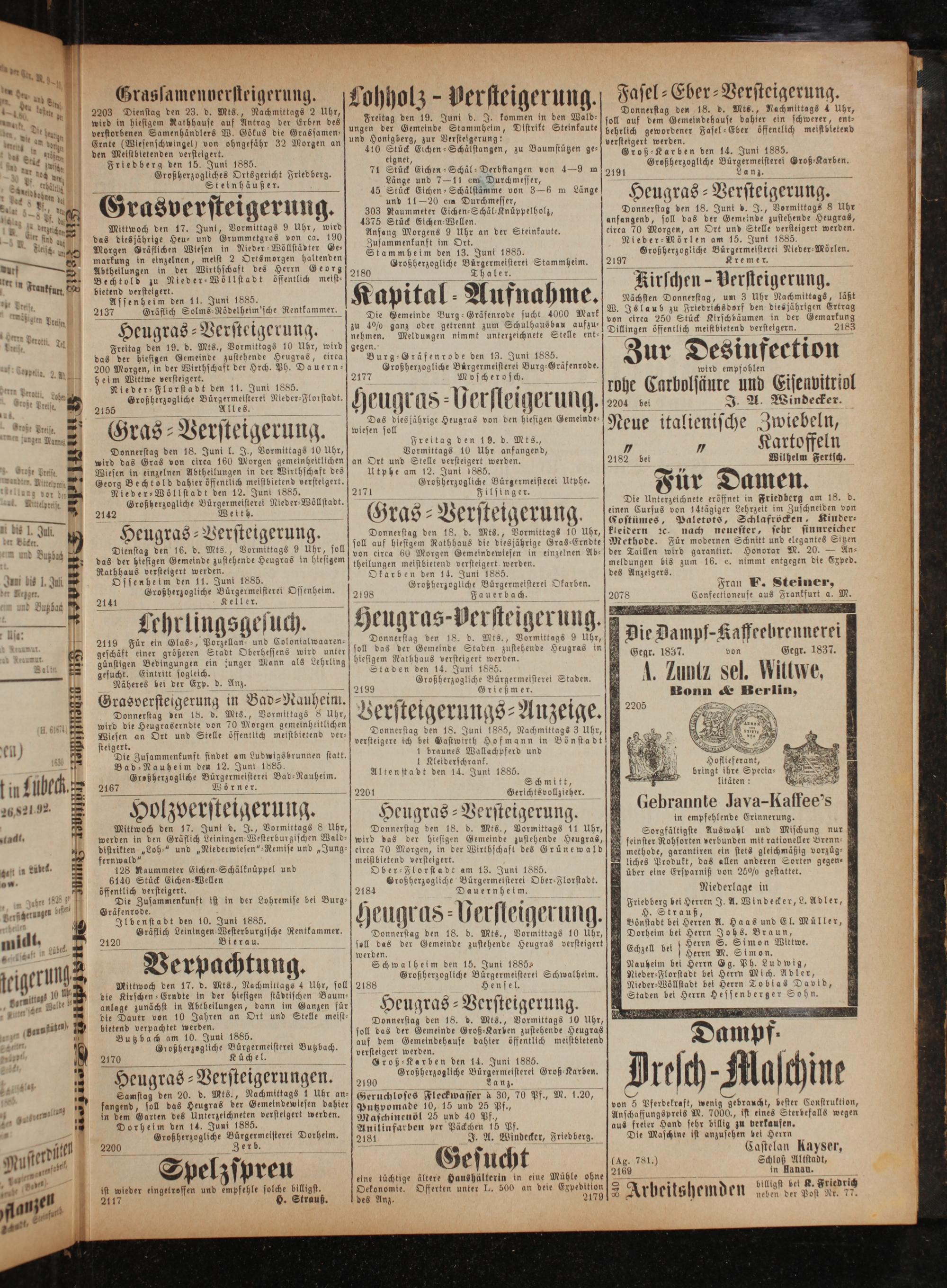 8 tei b as⸗A 701 Versteigerungs-Anzeige. Donnerstag den 18. Juni 1885, Nachmittags 3 Uhr, versteigere ich bei Gastwirth Hofmann in Bönstadt 1 braunes Wallachpferd und 1 Kleiderschrank. Altenstadt den 14. Juni 1885. Schmitt, 2201 Gerichtsvollzieher. — 1 8 Heugras-Versteigerung. Donnerstag den 18. d. Mts., Vormittags 11 Uhr, wird das der hiesigen Gemeinde zustehende Heugras, eirea 70 Morgen, in der Wirthschaft des Grünewald meistbietend versteigert. Ober⸗Florstadt am 13. Juni 1885. Großherzogliche Bürgermeisterei Ober-Florstadt.