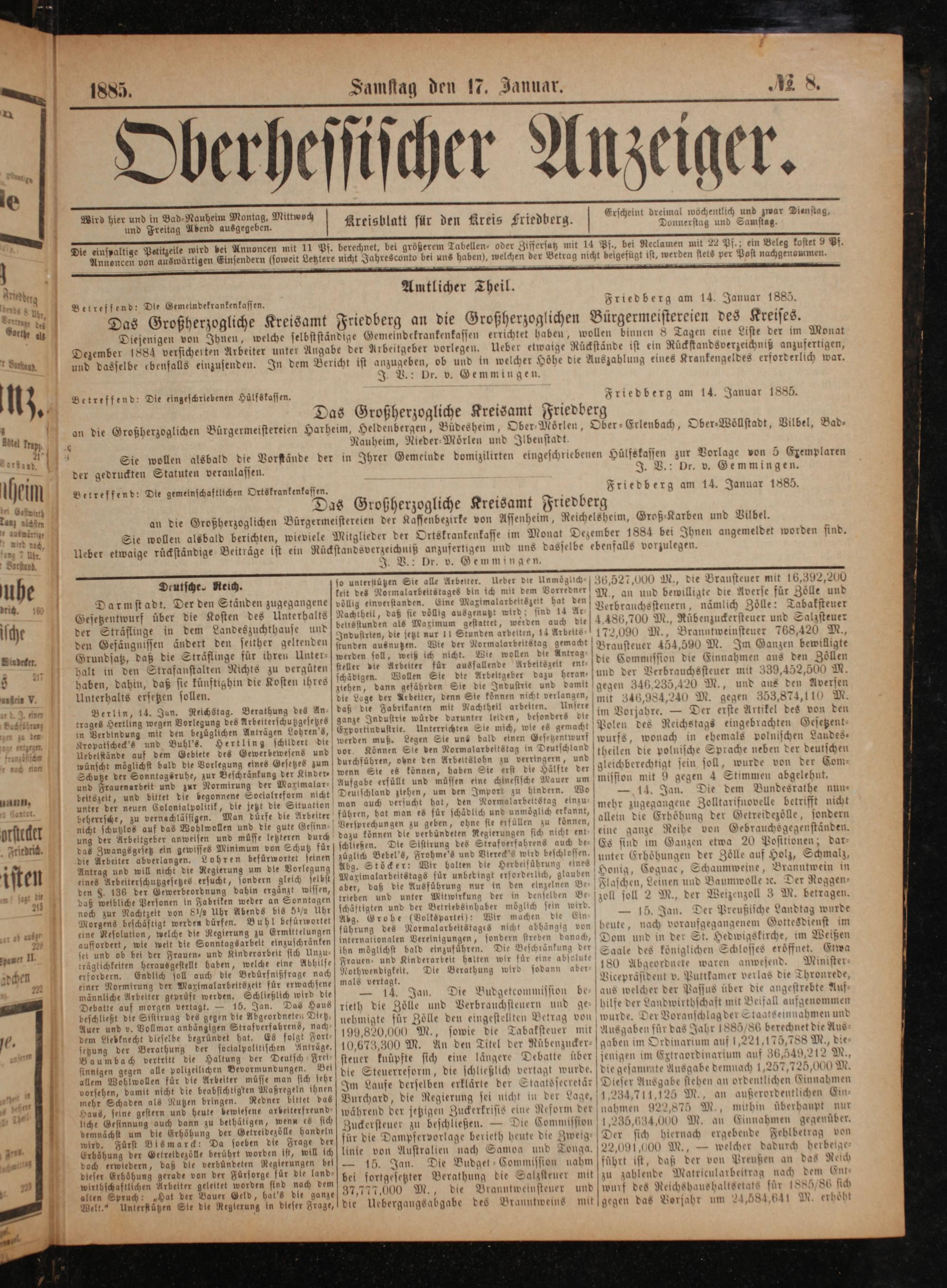 Das Großherzogliche Kreisamt Friedberg ssenbezirke von Assenheim, Reichelsheim, Groß-Karben und Vilbel. Ortskrankenkasse im Monat Dezember 1884 bei Ihnen angemeldet worden sind.